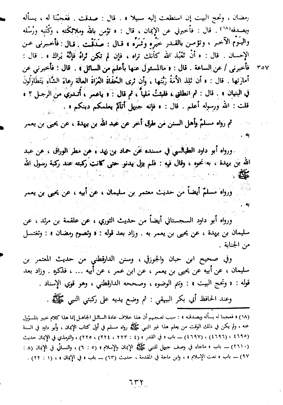 رمضان وتحج البيت إن استطعت إليه سبيلا قال صدقت فعجبنا له يسأله ويصدقه قال فأخبرني عن الإيمان قال تؤمن بالله وملائكته وكتبه ورسله واليوم الآخر وتؤمن بالقدر خيره وشره قال صدقت قال فأخبرني عن الأحسان قال أن تعبد الله كأنك تراه فإنه يراك قال فأخبرني عن الساعة قال ما المسئول عنها أعلم من السائل قال فأخبرني عن أمارتها قال أن تلد الأمة ربتها وأن ترى الحفاة العراة العالة رعاء الشاء يتطاولون في البنيان قال ثم انطلق فلبثت مليا ثم قال يا عمر أتدري من الرجل قلت الله ورسول الله أعلم قال فإنه جبريل أتاكم يعلمكم دينكم ثم رواه مسلم وأهل السنن من طرق أخر عن عبد الله بن بريدة عن يحيى بن يعمر به ورواه أبو داود الطيالسي في مسنده عن حماد بن زيد عن مطر الوراق عن عبد الله بن بريدة به نحوه وقال فيه فلم يزل يدنو حتى كانت ركبته عند ركبة رسول الله صلى الله عليه وسلم ورواه مسلم أيضا من حديث معتمر بن سليمان عن أبيه عن يحيى بن يعمر به ورواه أب داود السجستاني أيضا من حديث الثوري عن علقمة بن مرثد عن سليمان بن بريدة عن يحيى بن يعمر به وزاد بعد قوله وتصوم رمضان وتغتسل من الجنابة وفي صحيح ابن حبان والجوزقي وسنن الدارقطني من حديث المعتمر بن سليمان عن أبيه عن يحيى بن يعمر عن ابن عمر عن أبيه فذكره وزاد بعد قوله وتحج البيت وتتم الوضوء وصححه الدارقطني وهو قوي الإسناد وعند الحافظ أبي بكر البيهقي ثم وضع يديه على ركبتي النبي صلى الله عليه وسلم