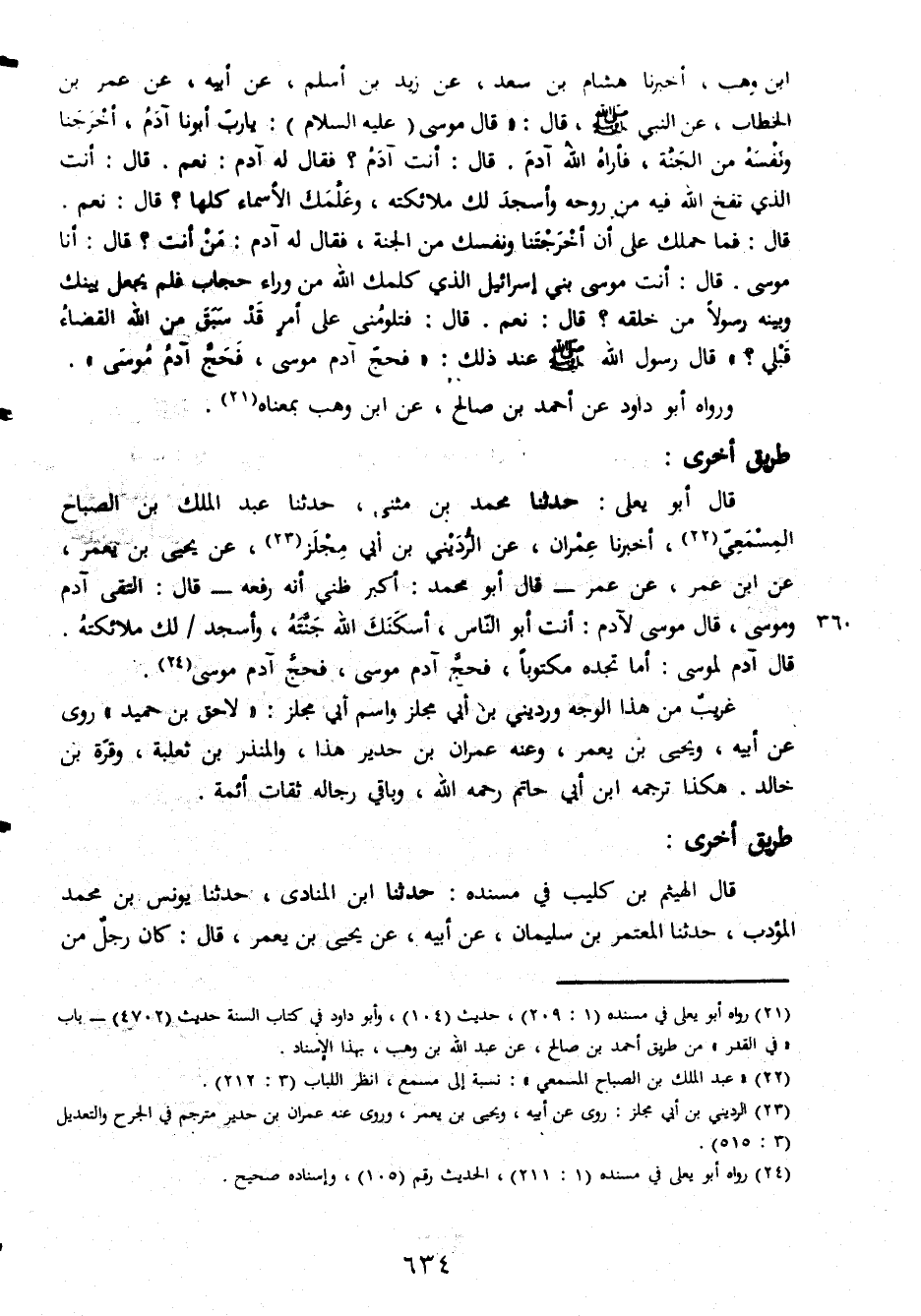 ابن وهب أخبرنا هشام بن سعد عن زيد بن أسلم عن أبيه عن عمر بن الخطاب عن النبي صلى الله عليه وسلم قال قال موسى عليه السلام يارب أبونا أدم أخرجنا ونفسه من الجنة فأراه الله أدم قال أنت أدم فقال له أدم نعم قال أنت الذي نفخ الله فيه من روحه وأسجد لك الملائكته وعلمك الأسماء كلها قال نعم قال فما حملك على أن أخرجتنا ونفسك من الجنة فقال له آدم من أنت قال أنا موسى قال أنت موسى بني إسرائيل الذي كلنه الله من وراء حجاب فلم يجعل بينك وبينه رسولا من خلقه قال نعم قال فتلومنى على امر قد سبق من الله القضاء قبلي قال الرسول الله صلى الله عليه وسلم عند ذلك فحجّ آدم موسى فحجّ آدم موسى ورواه أبو داود عن أحمد بن صالح عن ابن وهب معناه طريق أخرى قال أبو يعلى حدثنا محمد بن مثنى حدثنا عبد الملك بن الصباح المسمعي أخبرنا عمران عن الرديني بن أبي مجلز عن يحيى بن يعمر عن ابن عمر عن عمر قال ابو محمد أكبر ظني أنه رفعه قال التقى آدم وموسى قال موسى لآدم أنت أبو الناس أسكنك الله جنته وأسجد لك الملائكته قال آدم لموسى أما تجده مكتوبا فحج آدم موسى فحج آدم موسى غريب من هذا الوجه ورديني بن أبي مجلز واسم أبي مجلز لاحق بن حميد روى عن أبيه ويحيى بن يعمر وعنه عمران بن حدير هذا والمنذر بن ثعلبة وقّرة بن خالد هكذا ترجمه ابن أبي حاتم رحمه الله وباقي رجاله ثقات أئمة طريق أخرى قال الهيثم بن كليب في مسنده حدثنا ابن المنادى حدثنا يونس بن محمد المؤدب حدثنا المعتمر بن سليمان عن أبيه عن يحيى بن يعمر قال كان رجل من