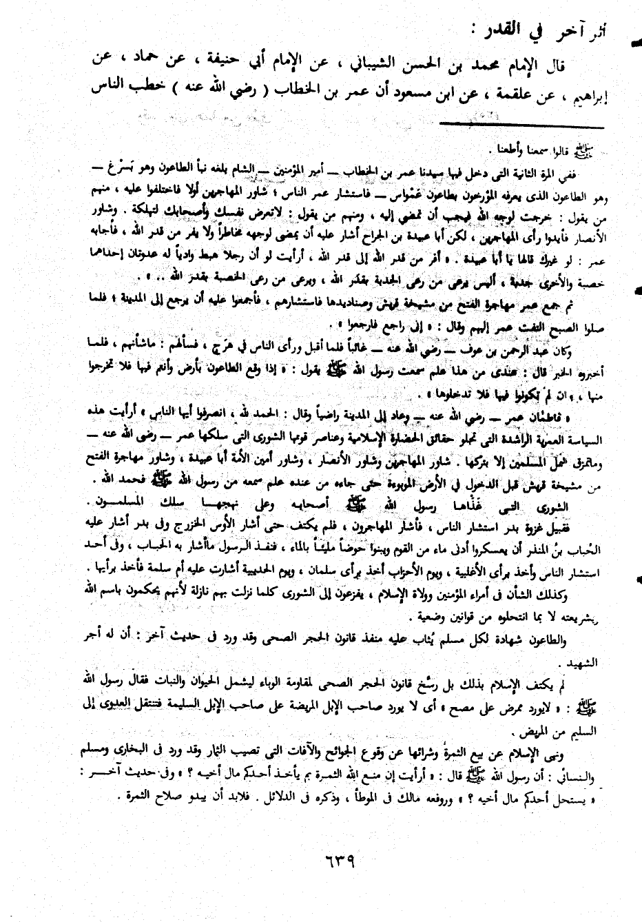 أثر آخر في القدر قال الإمام محمد بن الحسن الشباني عن الإمام أبي حنيفة عن حماد عن إبراهيم عن علقمة عن ابن مسعود أن عمر بن الخطاب رضي الله عنه خطب الناس