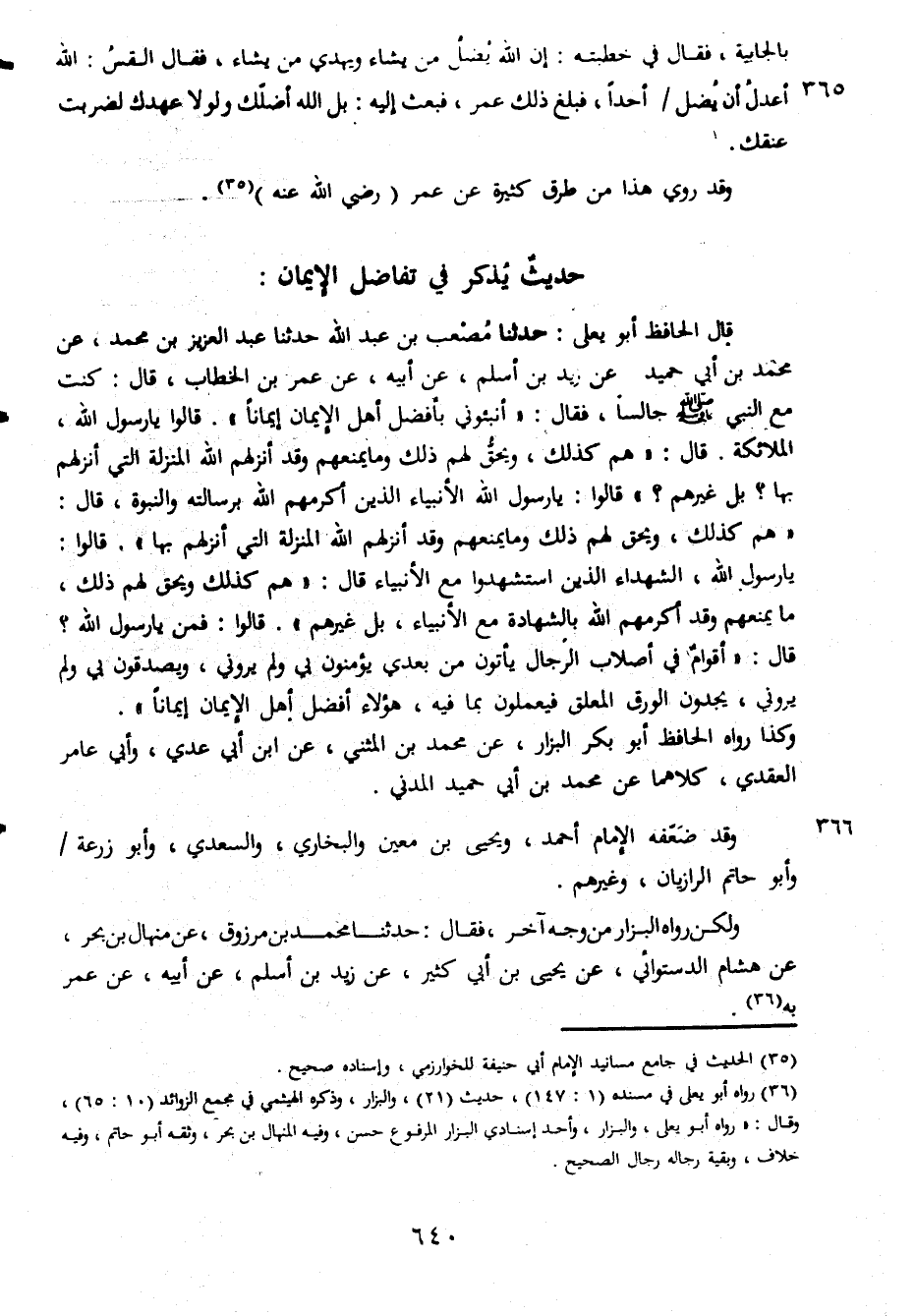 بالجابية فقال في خطبته إن الله يضل من يشاء ويهدي من يشاء فقال القس الله أعدل أن يضل أحدا فبلغ ذلك عمر فبعث إليه بل الله أضلك ولولا عهدك لضربت عنقك وقد روي هذا من طرق كثيرة عن عمر رضي الله عنه حديث يذكر في تفاضل الإيمان قال الحافظ أبو يعلى حدثنا مصعب بن عبد الله حدثنا عبج العزيز بن محمد عن محمد بن أبي حميد عن زيد بن أسلم عن أبيه عن عمر بن الخطاب قال كنت مع النبي صلى الله عليه وسلم جالسا فقال أنبئوني بأفضل أهل الإيمان إمانا قالوا يا رسول الله الملائكة قال هم كذلك ويحق لهم ذلك وما يمنعهم وقد أنزلهم الله المنزلة التي أنزلهم بها بل غيرهم قالوا يا رسول الله الأنبياء الذين أكرمهم الله برسالته والنبوة قال هم كذلك ويحق لهم ذلك وما يمنعهم وقد أنزلهم الله المنزلة التي أنزلهم بها قالوا يا رسول الله الشهداء الذين استشهدوا مع الأنبياء قال هم كذلك ويحق لهم ذلك وما يمنعهم وقد أكرمهم الله بالشهادة مع الأنبياء بل غيرهم قالوا فمن يا رسول الله قال أقوام في أصلاب الرجال يأتون من بعدي يؤمنون بي ولم يروني ويصدقون بي ولم يروني يجدون الورق المعلق فيعملون بما فيه هؤلاء أقضل أهل الإيمان إيمانا وكذا رواه الحافظ أبو بكر البزار عن محمد بن المثني عن ابن أبي عدي وأبي عامر العقدي كلاهما عن محمد بن أبي حميد المدني وقدضعّفه الإمام أحمد ويحيى بن معين والبخاري والسعدي وأبو زرعة وأبو حاتم الرازيان وغيرهم ولكن رواه البزار من وجه آخر فقال حدثنا محمد بن مرزوق عن منهال بن بحر عن هشام الدستوائي عن يحيى بن أبي كثير عن زيد بن أسلم عن أبيه عن عمر به