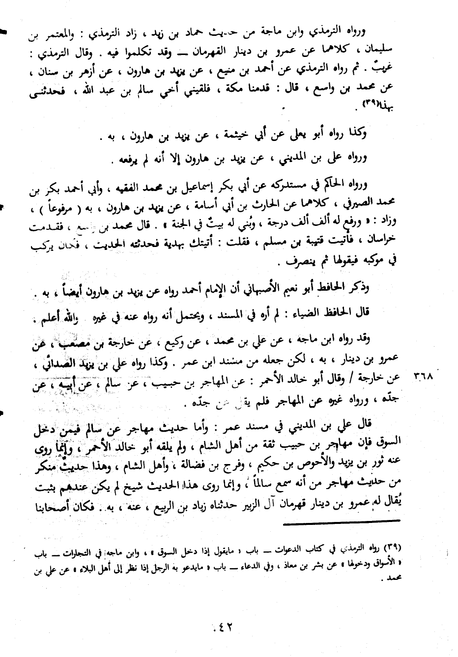 ورواه الترمذي وابن ماجة من حديث حماد بن زيد زاد الترمذي والمعتمر بن سليمان كلاهما عن عمرو بن دينار القهرمان وقد تكلموا فيه وقال الترمذي غريب ثم رواه الترمذي عن أحمد بن منيع عن زيد بن هارون عن أزهر بن سنان عن محمد بن واسع قال قدمنا مكة فلقيني أخي سالم بن عبد الله فحدثني بهذا وكذا رواه ابو يعلى عن ابي خيثمة عن يزيد بن هارون به ورواه علي بن المديني عن يزيد بن هارون إلا أنه لم يرفعه ورواه الحاكم في مستدركه عن أبي بكر إسماعيل بن محمد الفقيه وأبي أحمد بكر بن محمد الصيرفي كلا هما عن لحارث بن أبي أسامة عن يزيد بن هارون به مرفوعا وزاد ورفع له ألف ألف درجة وبنى له بيت في الجنة قال محمد بن واسع فقدمت خراسان فأتيت قتيبة بن مسلم فقلت أتيتك بهدية فحدثته الحديث فكان يركب في موكبه فيقولها ثم ينصرف وذكر الحافظ أبو نعيم الأصبهاني أن الإمام أحمد رواه عن يزيد بن هارون أيضا به قال الحافظ الضياء لم أره في المسند ويحتمل أنه رواه عنه في غيره والله أعلم وقد رواه ابن ماجة عن علي بن محمد عن وكيع عن خارجة بن مصعب عن عمرو بن دينار به لكن جعله من مسند ابن عمر وكذا رواه علي بن يزيد الصدائي عن خارجة وقال ابو خالد الحمر عن المهاجر ابن حبيب عن سالم عن أبيه عن جده ورواه غيره عن المهاجر فلم يقل عن جده قال علي بن المديني في مسند عمر واما حديث مهاجر عن سالم فيمن دخل السوق فإن مهاجر بن حبيب ثقة من أهل الشام ولم يلقه أبو خالد الأحمر وإنما روى عنه ثور بن يزيد والأحوص بن حكيم وفرج بن فضالة وأهل الشام وهذا حديث منكر من حديث مهاجر من أنه سمع سالما وإنما روى هذا الحديث شيخ لم يكن عندهم بثبت يقال له عمرو بن دينار قهرمان آل الزبير حدثناه زياد بن الربيع عنه به فكان أصحابنا