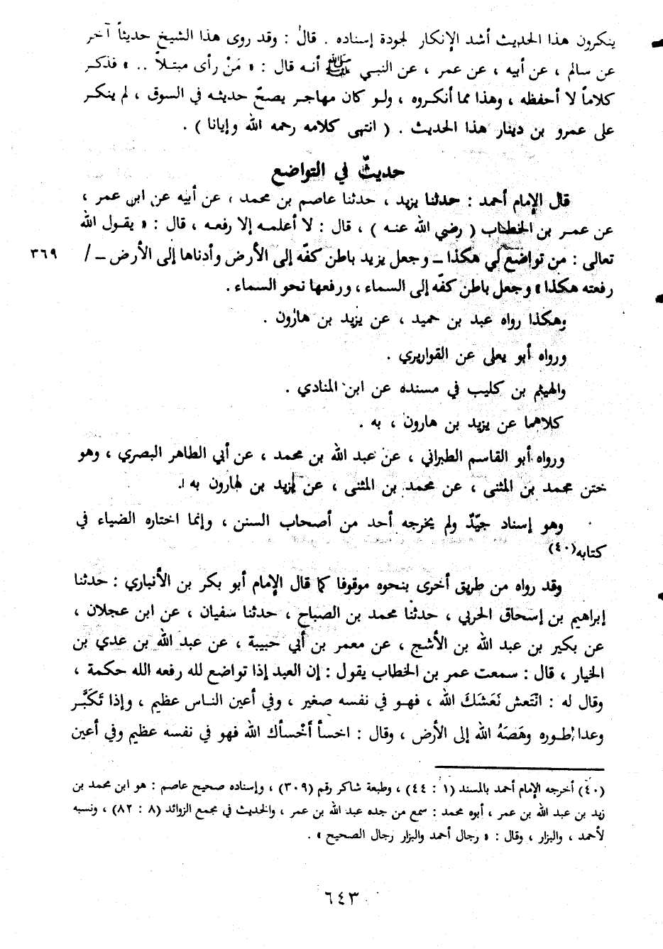 ينكرون هذا الحديث أشد الإنكار لجودة إسناده قال وقد روى هذا الشيخ حديثا آخر عن سالم عن أبيه عن عمر عن النبي صلى اله عليه وسلم أنه قال من رأى مبتلا فذكر كلاما لا أحفظه وهذا مما أنكروه ولو كان مهاجر يصحّ حديثه في السوق لم ينكر على عمرو بن دينار هذا الحديث انتهى كلامه رحمه الله إيانا حديث في التواضع قال الإمام أحمد حدثنا يزيد حدثنا عاصم بن محمد عن أبيه عن أبيه عن ابن عمر عن عمر بن الخطاب رضي الله عنه قال لا أعلمه إلا رفعه قال يقول الله تعالى من تواضع لي هكذا وجعل يزيد باطن كفه إلى الأرض وأدناها إلى الأرض رفعته هكذا وجعل باطن كفه إلى السماء ورفعها نحو السماء وهكذا رواه عبد بن حميد عن يزيد بن هارون ورواه أبو يعلى عن القواريري والهيثم بن كليب في مسنده عن ابن المنادي كلاهما عن يزيد بن هارون به ورواه أبو القاسم الطبراني عن عبد الله بن محمد عن أبي الطاهر البصري وهو ختن محمد بن المتني عن محمد بن المتني عن يزيد بن هارون به وهوإسناد جيد ولم يخرجه أحد من أصحاب السنن وإنما أختاره الضياء في كتابه وقد رواه من طريق أخرى بنحوه موقوفا كما قال الإمام أبو بكر بن الإنباري حدثنا إبراهيم بن إسحاق الحربي حدثنا محمد بن الصباح حدثنا سفيان عن ابن عجلان عن بكير بن عبد الله بن الأشج عن معمر بن أبي حبيبة عن عبد اله بن عدي بن الخيار قال سمعت عمر بن الخطاب يقول إن العبد إذا تواضع لله رفعه الله حكمة وقال له انتعش نعشك الله فهو في نفسه صغير وفي أعين الناس عظيم وإذا تكبر وعدا طوره وهصه الله إلى الأرض وقال اخسأ أخسأك الله فهو في نفسه عظيم وفي أعين