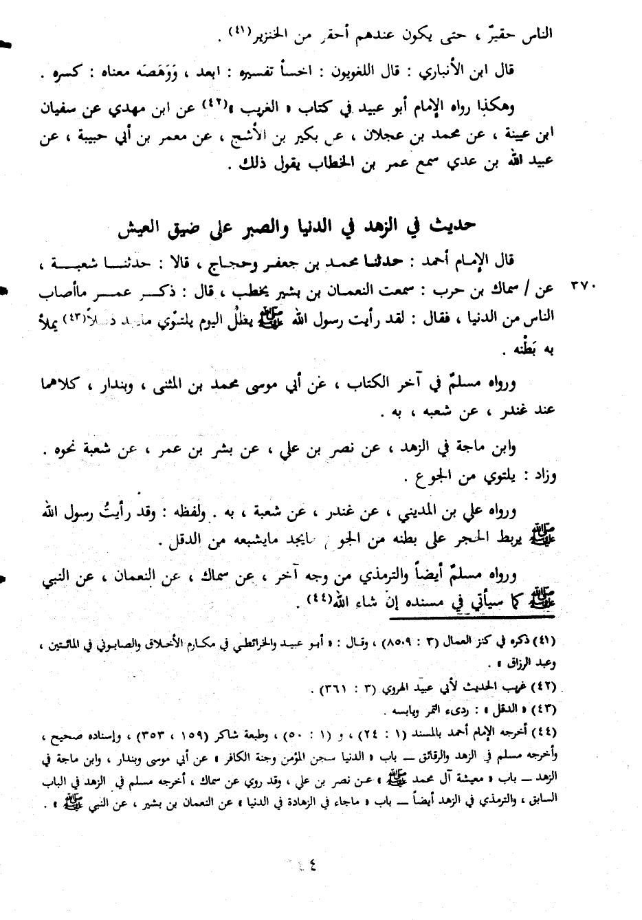 الناس حقير حتى يكون عندهم أحقر من الخنزير قال ابن الأنباري قال اللغويون اخسأ تفسيره ابعد ووهصه معناه كسره وهكذا رواه الإمام أبو عبيد في كتاب الغريب عن ابن مهدي عن سفيان ابن عيينة عن محمد بن عجلان عن بكير ابن الأشج عن معمر بن أبي حبيبة عن عبيد الله بن عدي سمع عمر بن الخطاب يقول ذلك حديث في الزهد في الدنيا والصبر على ضيق العيش قال الإمام أحمد حدثنا محمد بن جعفر وحجاج قلا حدثنا شعبة عن سماك بن حرب سمعت النعمان بن بشير يخطب قال ذكر عمر ما أصاب الناس من الدنيا فقال لقد رأيت رسول الله صلى الله عليه وسلم يظّل اليوم يتلوي ما يجد دقلا يملأ به بطنه ورواه مسلم في آخر الكتاب عن أبي موسى محمد بن المثني وبندار كلاهما عند غندر عن شعبة به وابن ماجة في الزهد عن نصربن علي عن بشر بن عمر عن شعبه نحوه وزاد يتلوي من الجوع ورواه علي بن المديني عن غندر عن شعبه به ولفظه وقد رأيت رسول الله صلى الله عليه وسلم يربط الحجر على بطكنه من الجوع ما يجد ما يشبعه من الدقل ورواه مسلم ايضا والترمذي من وجه آخر عن سماك عن النعمان عن النبي صلى الله عليه وسلم كما سيأتي في مسنده إن شاء الله