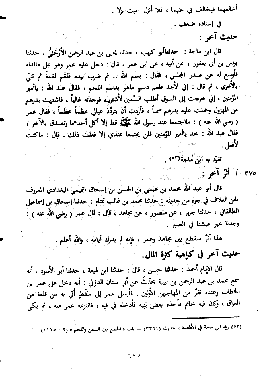 أخالفهما فيخالف بي عنهما فلا أنزل حيث نزلا في إسناده ضعف حديث آخر قال ابن ماجة حدثنا أبو كريب حدثنا يحيى بن عبد الرحمن الأرحبي حدثنا يونس بن أبي يعفور عن أبيه عن ابن عمرقال دخل عليه عمر وهو على مائدته فأوسع له عن صدر المجلس فقال بسم الله ثم ضرب بيده فلقم لقمة ثم ثني بالأخرى ثم قال إني لأجد طعم دسم ما هو بدسم اللحم فقال عبد الله يا أمير المؤمنين إني خرجت إلى السوق أطلب السمن لأشتريه فوجدته غاليا فاشتريت بدرهم من المهزول وحملت عليه بدرهم سمنا فأردت أن يتردد عيالي عظما عظما فقال عمر رضي الله عنه ما اجتمعا عند رسول الله صلى الله عليه وسلم قط إلا أكل أحدهما وتصدق بالآخر فقال عبد الله خذ يا أمير المؤمنين فلن يجتمعا عندي إلا فعلت ذلك قال ما كنت لأفعل تفرد به ابن ماجة أثر آخر قال أبو عبد الله محمد بن عيسى بن الحسن بن إسحاق التميمي البغدادي المعروف بابن العلاف في جزء من حديثه حدثنا محمد بن غالب تمتام حدثنا إسحاق بن إسماعيل الطالقاني حدثنا جرير عن منصور عن مجاهد قال قال عمر رضي الله عنه وجدنا خير عيشنا في الصبر هذا أثر منقطع بين مجاهد وعمر فإنه لم يدرك أيامه والله أعلم حديث آخر في كراهية كثرة المال قال الإمام أحمد حدثنا حسن قال حدثنا ابن لهيعة حدثنا أبو الأسود أنه سمع محمد بن عبد الرحمن بن لبيبة يحدث عن أبي سنان الدؤلي أنه دخل على عمر بن الخطاب وعنده نفر من المهاجرين الأولين فارسل عمر إلى سفط أتي به من قلعة من العراق وكان فيه خاتم فأخذه بعض بنيه فأذخله في فيه فانتزعه عمر منه ثم بكى