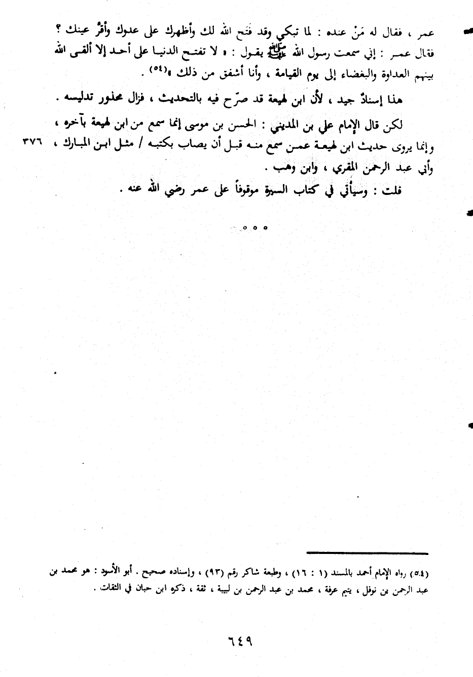 عمر فقال له من عنده لما تبكي وقد فتح الله لك وأظهرك على عدوك وأقرّ عينك فقال عمر إني سمعت رسول الله صلى الله عليه وسلم يقول لا تفتح الدنيا على أحد إلا ألقى الله بينهم العداوة والبغضاء إلى يوم القيامة وأنا أشفق من ذلك هذا إسناد جيد لأن ابن لهيعة قد صرح فيه بالتحديث فزال محذور تدليسه لكن قال الإمام علي بن المديني الحسن بن موسى إنما سمع من ابن لهيعة بآخره وإنما يروى حديث ابن لهيعة عمن سنع منه قبل أن يصاب بكتبه مثل ابن المبارك وأبي عبد الرحمن المقري وابن وهب قلت وسيأتي في كتاب السيرة موقوفا على عمر رضي الله عنه