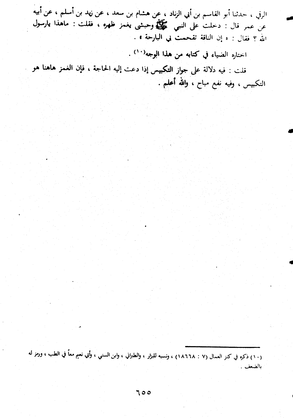 الرقي حدثنا أبوالقاسم بن أبي الزياد عن هشام بن سعد عن زيد بن أسلم عن أبيه عن عمر قال دخلت على النبي صلى الله عليه وسلم وحبشي يغمز ظهره فقلت ما هذا يا رسول الله فقال إن الناقة تقحمت بي البارحة اختاره الضياء في كتابه من هذا الوجه