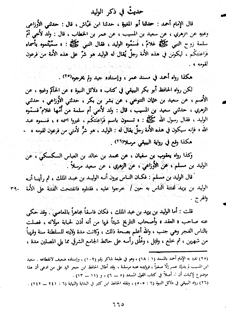 حديث في ذكر الوليد قال الإمام أحمد حدثنا أبو المغيرة حدثنا ابن عياش قال حدثني الأوزاعي وغيره عن الزهري عن سعيد بن المسيب عن عمر بن الخطاب قال ولد لأخي أمّسلمة زوج النبي صلى الله عليه وسلم غلام فسمّوه الوليد فقال النبي صلى الله عليه وسلم سميتموه بأسماء فراعنتكم ليكونن في هذه الأمة رجل يقال له الوليد هو شر على هذه الأمة من فرعون لقومه هكذا رواه أحمد في مسند عمر وغسناده جيد ولم يخرجوه لكن رواه الحافظ أبو بكر البيهقي في كتاب دلائل النبوة عن الحاكم وغيره عن الأصم عن سعيد بن عثمان التنوخي عن بشر بن بكر حدثني الأوزاعي حدثني الزهري حدثني سعيد بن المسيب قال ولد لخي أم سلمة من أمها غلام فسموه الوليد فقال رسول الله صلى الله عليه وسلم تسمون باسم فراعنتكم غيروا اسمه فسموه عبد اله فإنه سيكون في هذه الأمة رجل يقال له الوليد هو شر لأمتي من فرعون لقومه هكذا وقع في رواية البيهقي مرسلا وكذا رواه يعقوب بن سفيان عن محمد بن خالد بن العباس السكسكي عن الوليد بن مسلم عن الأوزاعي عن الزهري عن سعيد مرسلا قال الوليد بن مسلم فكان الناس يرون أنه الوليد بن عبد الملك ثم راينا أنه الوليد بن يزيد لفتنة الناس به حين خرجوا عليه فقتلوه فانفتحت الفتنة على الأمة والهرج قلت أما الوليد بن يزيد بن عبد الملك فكان فاسقا مجاهرا بالمعاصي وقد حكى عنه صاحب العقد واصحاب التاريخ شيئا فريا من أنه أذن لحبابة مولاته فصلت بالناس الفجر وهي جنب والله أعلم بصحة ذلك وكانت مدة ولايته للسلطنة سنة وقريبا من شهرين ثم خلع وقتل وغلق رأسه على الحائط الجامع الشرقي ممايلي المصلين مدة