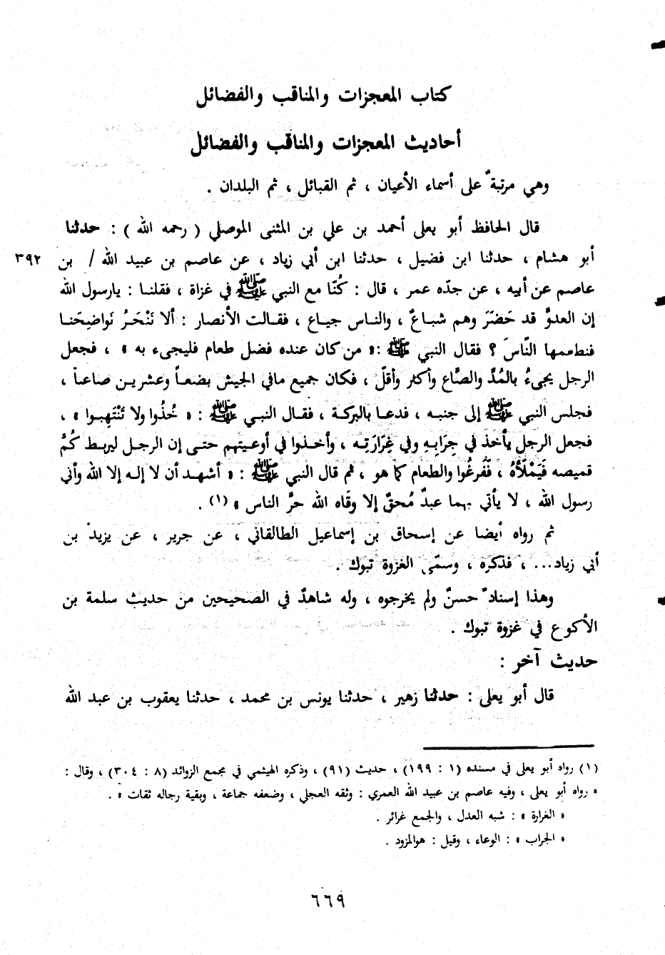 أحاديث المعجزات والمناقب والفضائل وهي مرتبة على أسماء الأعيان ثم القبائل ثم البلدان. قال أبو حافظ أبو يعلى أحمد بن علي بن المثنى الموصلي (رحمه الله) حدثنا أبو هشام حدثنا ابن فضيل حدثنا ابن ابي زياد عن عاصم بن عبيد الله بن عاصم عن أبيه عن جده عمر قال كنا مع النبي صلى الله عليه وسلم في غزاة فقلنا يا رسول الله إن العدو قد حضر وهم شباع والناس جياع فقالت الأنصار ألا ننحر نواضحنا فنطعمها الناس فقال النبي صلى الله عليه وسلم «من كان عنده فضل طعام فليجئ به» فجعل الرجل يجئ بالمد والصاع وأكثر وأقل فكان جميع ما في الجيش بضعا وعشرين صاعا فجلس النبي صلى الله عليه وسلم إلى جنبه فدعا بالبركة فقال النبي صلى الله عليه وسلم خذوا ولا تنتبهوا فجعل الرجل يأخذ في جرابه وفي غرارته وأخذوا في أوعيتهم حتى إن الرجل ليربط كمّ قميصه فيملأه ففرغوا والطعام كما هو ثمّ قال النبي صلى الله عليه وسلم أشهد أن لا إله إلاّ الله وأنّي رسول الله لا يأتي بهما عبد محق إلا وقاه الله حرّ الناس ثمّ رواه أيضا عن إسحاق بن إسماعيل الطالقاني عن جرير عن يزيد بن ابي زياد ... فذكره وسمى الغزوة تبوك وهذا إسناد حسن ولم يخرجوه وله شاهد في الصحيحين من حديث سلمة بن الأكوع في غزوة تبوك حديث آخر قال أبو يعلى حدثنا زهير حدثنا يونس بن محمد حدثنا يعقوب بن عبد الله