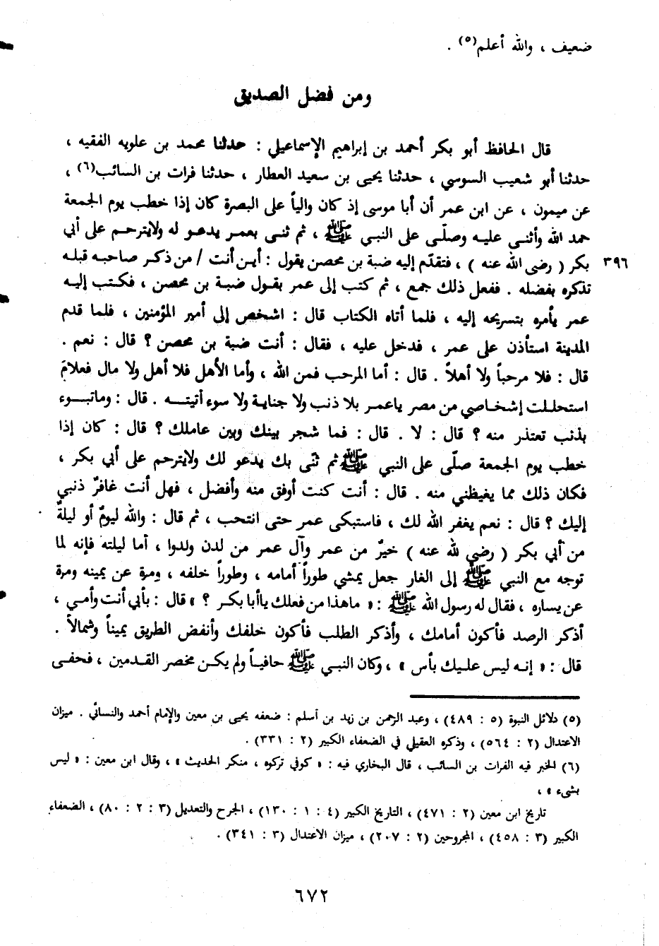 ضعيف والله أعلم ومن فضل الصديق قال الحافظ أبو بكر أحمد بن أحمد بن إبراهيم الإسماعيلي حدثنا محمد بن علويه الفقيه حدثنا أبو شعيب السوسي حدثنا يحي بن سعيد العطار حدثنا فرات بن السائب عن ميمون عن ابن عمر أن أبا موسى إذ كان واليا على البصرة كان إذا خطب يوم الجمعة حمد الله وأثنى عليه وصلّى على النّبي صلى الله عليه وسلم ثم ثنى بعمر يدعو له ولا يترحم على أبي بكر رضي الله عنه فتقدم إليه ضبة بن محصن أين أنت من ذكر صاحبه صاحبه قبله تذكره بفضله ففعل ذلك جمع ثم كتب إلى عمر بقول ضبة بن محصن فكتب إليه عمر يأمره بتسريحه إليه فلما أتاه الكتاب قال اشخص إلى أمير المؤمنين فلما قدم المدينة استتأذن على عمر فدخل عليه فقال أنت ضبة بن المحصن قال نعم قال فلا مرحبا ولا أهلا قال أما المرحب فمن الله وأما الأهل فلا أهل ولا مال فعلام استحللت إشخاصي من مصر يا عمر بلا ذنب ولا جناية وسوء أتيته وما تبوء بذنب تعتذر منه قال لا قال فما شجر بينك وبين عاملك قال كان إذا خطب يوم الجمعة صلى على النبي صلى الله عليه وسلم ثم ثنّى بك يدعو لك ولا يترحم على أبي بكر فكان ذلك مما يغيظني منه قال أنت كنت أوفق منه وأفضل فهل أنت غافر ذنبي إليك قال نعم يغفر الله لك فاستبكى عمر حتى انتحب ثم قال والله ليوم أو ليلة من أبي بكر رضي الله عنه خير من عمر وآل عمر من لدن ولدوا أما ليلته فإنه لما توجه مع النبي صلى الله عليه وسلم إلى الغار جعل يمشي طورا أمامه وطورا خلفه ومرة عن يمينه ومرة عن يساره فقال له رسول الله صلى الله عليه وسلم ماهذا من فعالك يا أبا بكر قال بأبي أ، ت وأمي أذكر الرصد فأكون أمامك وأذكر الطلب فأكون خلفك وأنفض الطريق يمينا وشمالا قال إنه ليس عليك بأس وكان النبي صلى الله عليه وسلم حافيا ولم يكن مخصر القدمين فحفى