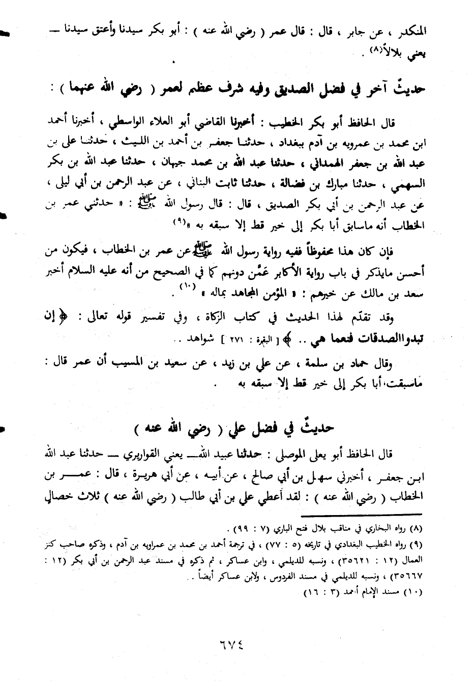 المنكدر عن جابر قال قال عمر رضي الله عنه أبو بكر سيدنا وأعتق سيدنا يعني بلالا حديث آخر في فضل الصديق وفيه شرف عظيم لعمر رضي الله عنهما قا الحافظ أبو بكر الخطيب أخبرنا القاضي أبو علاء الواسطي أخبرنا أحمد ابن محمد بن عمرويه بن آدم ببغداد حدثنا جعفر بن أحمد بن الليث حدثنا علي بن عبد الله بن جعفر الهمداني حدثنا عبد الله بن محمد جيهان حدثنا عبد الله بن بكر السهمي حدثنا مبارك بن فضالة حدثنا ثابت البناني عن عبد الرحمن بن أبي ليلى عن عبد الرحمن بن أبي بكر الصديق قال قال رسول الله صلى الله عليه وسلم حدثني عمر بن الخطاب أنه ماسبق أبا بكر إلى خير قط إلا سبقه به فإن كان هذا محظوظا ففيه رواية رسول الله صلى الله عليه وسلم فيكون من أحسن ما يذكر في باب رواية الأكابر عمّن دونهم كما في الصحيح من أنه عليه السلام أخبر سعد بن مالك عن خيرهم المؤمن المجاهد بماله وقد تقدم في هذا الحديث في كتاب الزكاة وفي تفسير قوله تعالى إن تبدو الصدقات فنعما هي شواهد وقال حماد بن سلمة عن علي بن زيد عن سعيد بن المسيب أن عمر قال ما سبقت أبا بكر إلى خير إلا سبقه به حديث في فضل علي رضي الله عنه قال الحافظ أبو يعلى الموصلي حدثنا عبيد الله يعني القواريري حدثنا عبد الله ابن جعفر أخبرني سهل بن أبي صالح عن أبيه عن أبي هريرة قال عمر بن الخطاب رضي الله عنه لقد أعطي علي بن أبي طالب ثلاث خصال