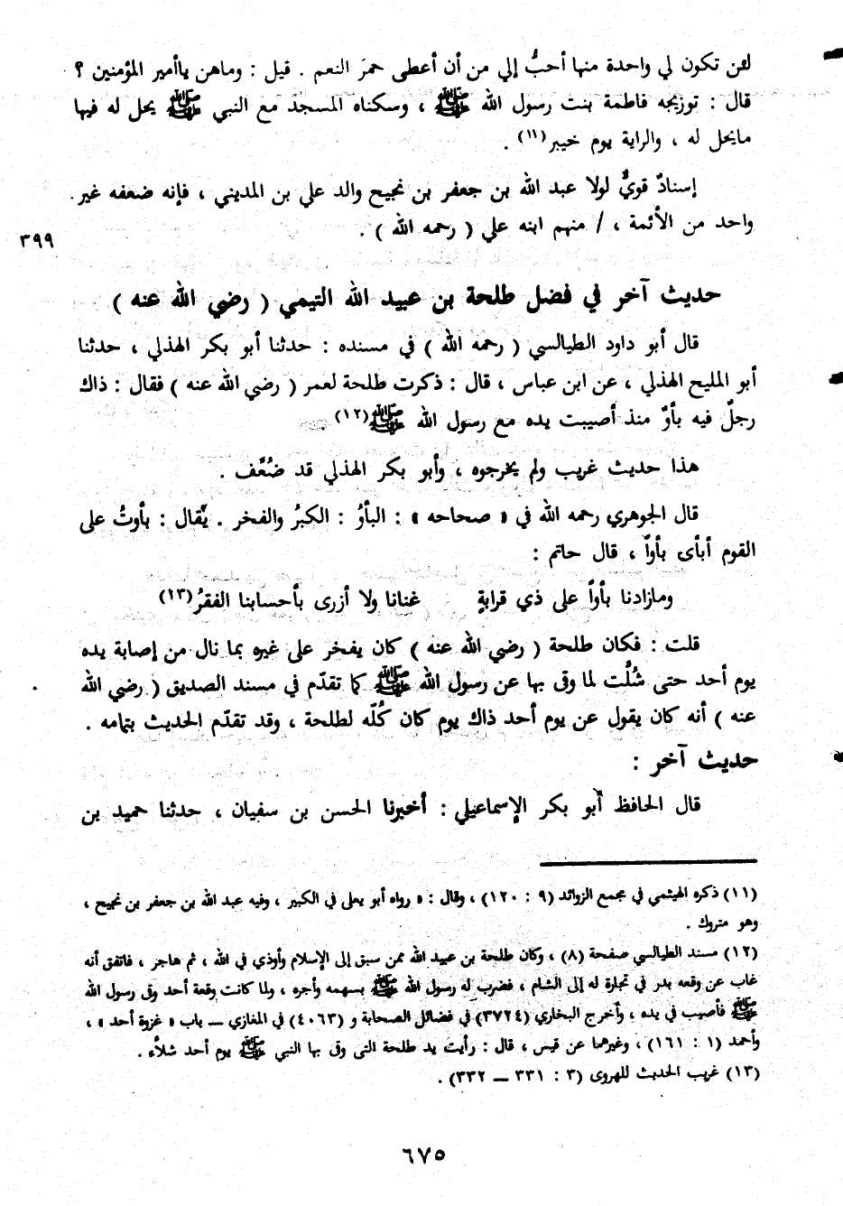 لئن تكون لي واحدة منها أحب إلي من أن أعطى حمر النعم قيل وما هن يا أمير المؤمنين تزويجه فاطمة بنت رسول الله صلى الله عليه وسلم وسكناه المسجد مع النبي صلى الله عليه وسلم يحل له فيها ما يحل له والراية يوم يخبر إسناد قوي لولا عبد الله بن جعفر بن نجيح والد علي بن المديني فإنه ضعفه غير واحد من الأئمة منهم ابنه علي رحمه الله حديث آخر في فضل طلحة بن عبيد الله التميمي رضي الله عنه قال أبو داود الطيالسي رحمه الله في مسنده حدثنا أبو بكر الهذلي حدثنا أبو المليح الهذلي عن ابن عباس قال ذكرت طلحة لعمر رضي الله عنه فقال ذلك رجل فيه بأو منذ أصيبت يده مع رسول الله صلى الله عليه وسلم هذا حديث غريب ولم يخرجوه وأبو بكر الهذلي قد ضعّف قال الجوهري رحمه الله في صحاحه البأو الكبر والفخر يقال بأوت على القوم أبأى بأوا قال حاتم وما زادنا بأوا على ذي قرابة غنانا ولا أزرى بأحسابنا الفقر قلت فكان طلحة رضي الله عنه كان يفخر على غيره بما نال من إصابة يده يوم أحد حتى شلت لما وقى بها عن رسول الله صلى الله عليه وسلم كما تقدم في مسند الصديق رضي الله عنه أنه كان يقول عن يوم أحد ذاك يوم كان كله لطلحة وقد تقدم الحديث بتمامه حديث آخر قال الحافظ أبو بكر الإسماعيلي أخبرنا الحسن بن سفيان حدثنا حميد بن