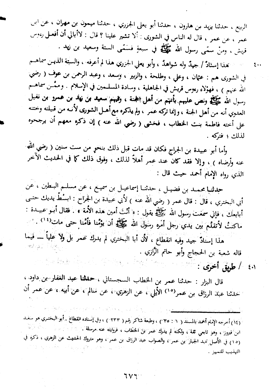 الربيع حدثنا يزيد بن هارون حدثنا أبو يعلى الجزري حدثنا ميمون بن مهران عن ابن عمر عن عمر قال له الناس في الشورى ألا تشير علينا قال لا أبالي أن أفعل رءوس قريش ومن سمى رسول الله صلى الله عليه وسلم في سبعة فسمي الستة وسعيد بن زيد هذا إسناد جيد وله شواهد وأبو يعلى الجزري هذا لم أعرفه والستة الذين سماهم في الشورى هم عثمان وعلي وطلحة والزبير وسعد وعبد الرحمن بن عوف رضي الله عنهمفهؤلاء رءوس قريش في الجاهلية وسادة المسلمين في الإسلام وممن سماهم رسول الله صلى الله عليه وسلم ونص عليهم بأنهم من أهل الجنة وفيهم سعيد بن زيد بن عمرو بن نفيل العدوي أنه أنه من أهل الجنة وإنما تركه عمر ولم يذكره مع أهل الشورى لأنه من قبيلته وختنه على أخته فاطمة بنت الخطاب فخشى رضي الله عنه إن ذكره معهم أن يرجحوه لذلك فتركه وأما أبو عبيدة بن الجراح فكان قد مات قبل ذلك بنحو من ست سنين رضي الله عنه وأرضاه وإلا فقد كان عمر أهلا لذلك وفوق ذلك كما في الحديث الآخر الذي رواه الإمام أحمد حيث قال حدثنا محمد بن فضيل حدثنا إسماعيل بن سميع عن مسلم البطين عن أبي البختري قال قال عمر رضي الله عنه لأبي عبيدة بن الجراح ابسط يديك حتى أبايعك فإني سمعت رسول الله صلى الله عليه وسلم يقول أنت أمين هذه الأمة فقال أبو عبيدة ما كنت لأتقدم بين يدي رجل أمره رسول الله صلى الله عليه وسلم أن يؤمنا فأمنا حتى مات هذا إسناد جيد وفيه انقطاع لأن أبا البختري لم يدرك عمر بل ولا عليا فيما قاله شعبة بن الحجاج وأبو حاتم الرازي طريق أخرى قال البزار حدثنا عمر بن الخطاب السجستاني حدثنا عبد الغفار بن داود حدثنا عبد الرزاق بن عمر الأيلي عن الزهري عن سالم عن أبيه عن عمر أن