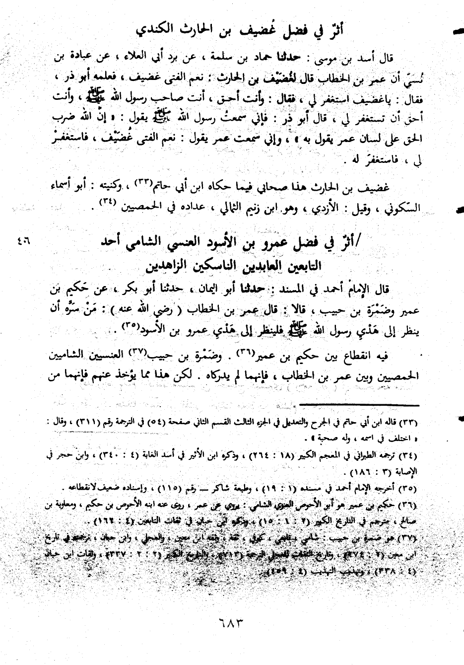 .. أثر في فضل غضيف بن الحارث الكندي قال أسد بن موسى حدثنا حماد بن سلمة عن برد أبي علاء عن عبادة بن نسي أن عمر بن الخطاب قال لغضيف بن الحارث نعم الفتى غضيف فعلمه أبو ذر فقال يا غضيف استغفر لي فقال وأنت أحق أنت صاحب رسول الله صلى الله عليه وسلم وأنت أن تستغفر لي قال أبو ذر فإني سمعت رسول الله صلى الله عليه وسلم يقول إن الله ضرب الحق على لسان عمر يقول به وإني سمعت عمر يقول نعم الفتى غضيف فاستغفر لي فاستغفر له غضيف بن الحارث هذا صحابي فيما حكاه بن أبي حاتم وكنيته أبو أسماء السكوني وقيل الأزدي وهو ابن زنيم الثمالي عداده في الحمصيين أثر في فضل عمرو بن الأسود العنسي الشامي أحد التابعين العابدين الناسكين الزاهدين قال الإمام أحمد في المسند حدثنا أبو بكر عن حكيم بن عمير وضمرة بن حبيب قالا قال عمر بن الخطاب رضي الله عنه من سره أن ينظر إلى هدي رسول الله صلى الله عليه وسلم فلينظر إلى هدي عمرو بن الأسود فيه انقطاع بين حكيم بن عمير وضمرة بن حبيب العنسيين الشاميين الحمصيين وبين عمر بن الخطاب فإنهما لم يدركاه لكن هذا مما يؤخذ عنهم فإنهما من