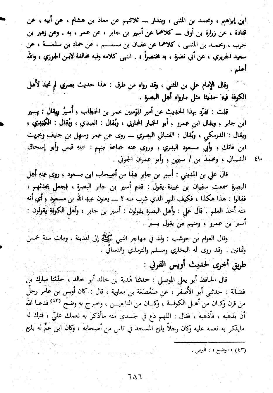 ابن ابراهيم ومحمد بن المثنى وبندار ثلاثتهم من عن معاذ بن هشام عن أبيه عن قتادة عن زرارة بن أوفى كلاهما عن أسير بن جابر عن عمر به وعن زهير بن حرب ومحمد بن المثنى كلاهما عن عفان بن مسلم عن حماد بن سلمة عن سعيد الجريري عن أبي نضرة به مختصرا انتهى كلامه وفيه مخالفة لابن الجوزي والله أعلم وقال الإمام علي بن المثنى وقد رواه من طرق وهذا حديث بصري لم نجد لأهل الكوفة فيه حديثا مثل ما رواه أهل البصرة قلت تفرد بهذا الحديث عن أمير المؤمنين عمر بن الخطاب أسير ويقال يسير ابن جابر ويقال ابن عمرو أبو الخيار المحاربي ويقال العبدي ويقال الكندي ويقال الدرمكي ويقال القتباني البصري روى عن عمر وسهل بن حنيف وخريت ابن فاتك وأبي مسعود البدري وروى عنه جماعة منهم ابنه قيس وأبو إسحاق الشيباني ومحمد بن سيرين وأبو عمران الجوني قال علي بن المديني أسير بن جابر هذا من أصحاب ابن مسعود روى عنه أهل البصرة سمعت سفيان بن عيينة يقول قدم أسير بن جابر البصرة فجعل يحدثهم فقالوا هذا هكذا فكيف النهر الذي شرب منه يعنون عبد الله بن مسعود أي أنه منه أخذ العلم قال علي وأهل البصرة يقولون أسير بن جابر وأهل الكوفة يقولون أسير بن عمرو ومنهم من يقول يسير وقال العوام بن حوشب ولد في مهاجر النبي صلى الله عليه وسلم إلى المدينة ومات سنة خمس وثمانين وقد روى له البخاري ومسلم والترمذي والنسائي طريق أخرى لحديث أويس القرني قال الحافظ أبو يعلى الموصلي حدثنا هدبة بن خالد أبو خالد حدثنا مبارك بن فضالة حدثني أبو الأصفر عن صعصعة بن معاوية قال كان أويس بن عامر رجل من قرن وكان من أهل الكوفة وكان من التابعين وخرج به وضح فدعا الله أن يذهبه فأذهبه فقال اللهم دع في جسدي منه ما أذكر به نعمك علي فترك له مايذكر به نعمة الله عليه وكان رجل يلزم المسجد في ناس من أصحابه وكان ابن عم له يلزم