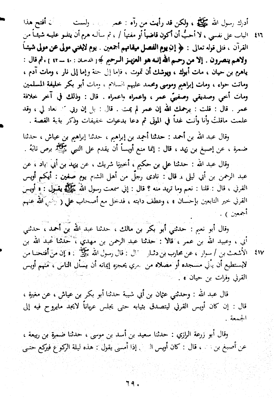 أدرك رسول الله صلى الله عليه وسلم ولكن قد رأيت من رآه عمر وغيره ولست أحب أن أفتح هذا الباب على نفسي لا أحب أن أكون قاضيا أو مفتيا ثم سأله هرم أن يتلو عليه شيئا من القرآن فتلى قوله تعالى إن يوم الفصل ميقاتهم أجمعين يوم لا يغني مولى عن مولى شيئا ولاهم ينصرون إلا من رحم الله إنه هو العزيز الرحيم ثم قال ياهرم بن حيان مات أبوك ويوشك أنت تموت فإما إلى جنة وإما إلى نار ومات آدم وماتت حواء ومات إبراهيم وموسى ومحمد عليهم السلام ومات أبو بكر خليفة المسلمين ومات أخي وصديقي وصفيي عمر واعمراه واعمراه قال وذلك في آخر خلافة عمر قال قلت يرحمك الله إن عمر لم يمت قال بل إن ربي قد نعاه لي وقد علمت ماقالت وأنا وأنت غدا في الموتى ثم دعا بدعوات خفيفات وذكر بقية القصة وقال عبد الله بن أحمد حدثنا أحمد بن إبراهيم حدثنا إبراهيم بن عياش حدثنا ضمرة عن إصبغ بن زيد قال إنما منع أويسا أن يقدم على النبي صلى الله عليه وسلم برص نابه وقال عبد الله حدثنا علي بن حكيم أخبرنا شريك عن يزيد بن أبي زياد عن عبد الرحمن بن أبي ليلى قال نادى رجل من أهل الشام يوم صفين أيكم أويس القرني قال قلنا نعم وما تريد منه قال إني سمعت رسول الله صلى الله عليه وسلم يقول أويس القرني خير التابعين بإحسان وعطف دابته فدخل مع أصحاب علي رضي الله عنهم أجمعين وقال أبو نعيم حدثني أبو بكر بن مالك حدثنا عبد الله بن أحمد حدثني أبي وعبيد الله بن عمر قالا حدثنا عبد الرحمن بن مهدي حدثنا عبد الله بن الأشعث بن سوار عن محارب بن دثار قال قال رسول الله صلى الله عليه وسلم إن من أفتحنا من لا يستطيع أن يأتي مسجده أو مصلاه من العري يحجزه إيمانه أن يسأل الناس منهم أويس القرني وفرات بن حيان قال عبد الله وحدثني عثمان بن أبي شيبة حدثنا أبو بكر بن عياش عن مغيرة قال إن كان أويس القرني ليتصدق بثيابه حتى يجلس عريانا لا ما يروح فيه إلى الجمعة وقال أبو زرعة الرازي حدثنا سعيد بن أسد بن موسى حدثنا ضمرة بن ربيعة عن أصبغ بن يزيد قال كان أويس القرني إذا أمسى يقول هذه ليلة الركوع فيركع حتى