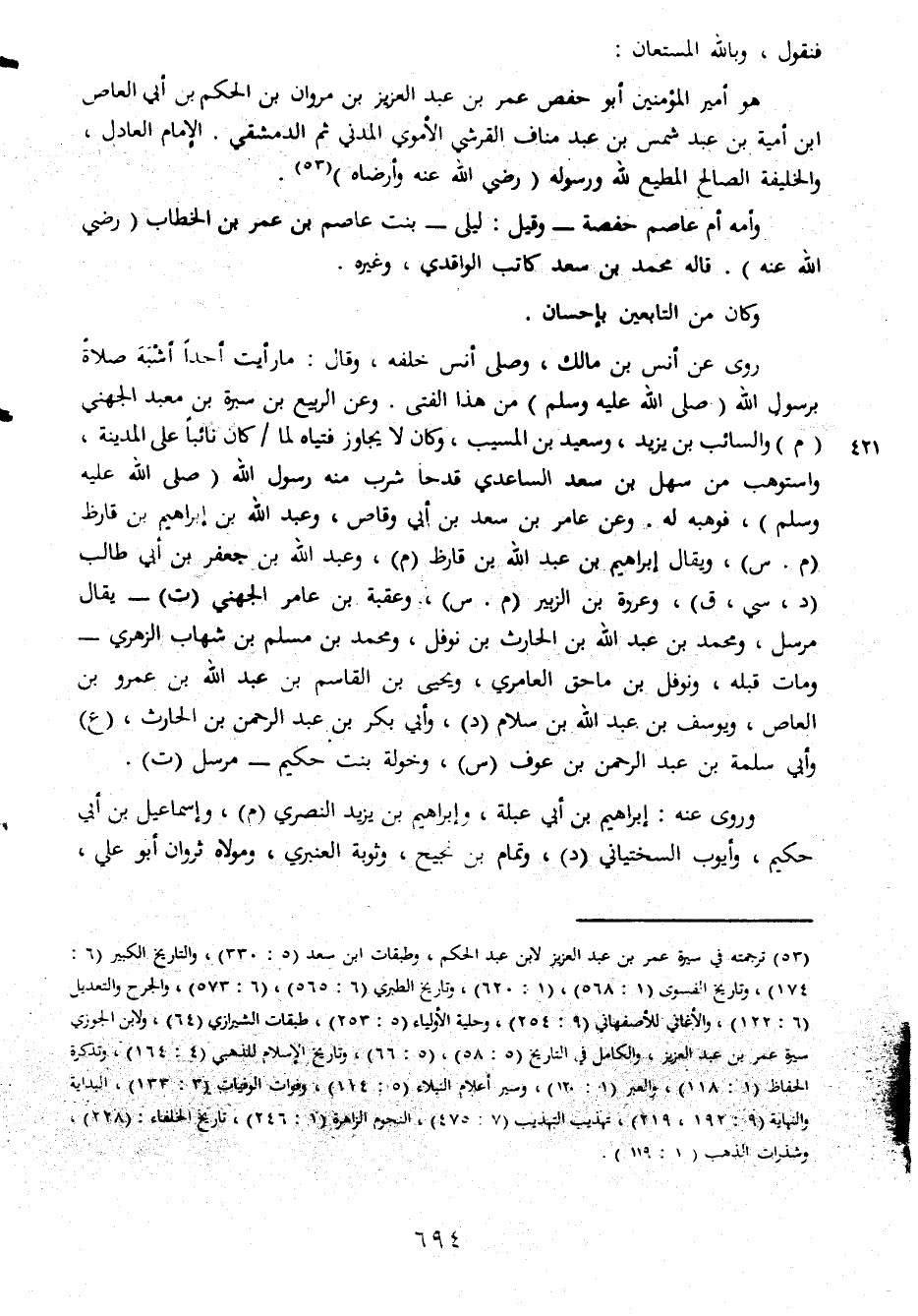 فنقول وبالله المستعان هو أمير المؤمنين أبو حفص عمر بن عبد العزيز بن مروان بن الحكم بن أبي العاص ابن أمية بن عبد شمس بن عبد مناف القرشي الأموي المدني ثم الدمشقي الإمام العادل والخليفة الصالح المطيع لله ورسوله رضي الله وأرضاه وأمه أم عاصم حفصة وقيل ليلى بنت عاصم بن عمر بن الخطاب رضي الله عنه قاله محمد بن سعد كاتب الواقدي وغيره وكان من التابعين بإحسان روى عن أنس بن مالك وصلى أنس خلفه وقال ما رأيت أحدا أشبه صلاة برسول الله صلى الله عليه وسلم من هذا الفتى وعن الربيع بن سبرة بن معبد الجهني والسائب بن يزيد وسعيد بن المسيب وكان لايجاوز فتياه لما كان نائبا على المدينة واستوهب من سهل بن سعد الساعدي قدحا شرب منه رسول الله صلى الله عليه وسلم فوهبه له وعن عامر بن سعد بن أبي وقاص وعبد الله بن إبراهيم بن قارظ ويقال إبراهيم بن عبد الله بن قارظ وعبد الله بن جعفر بن أبي طالب وعروة بن الزبير وعقبة بن عامر الجهني يقال مرسل ومحمد بن عبد الله بن الحارث بن نوفل ومحمد بن مسلم بن شهاب الزهري ومات قبله ونوفل بن ماحق العامري ويحيى بن القاسم بن عبد الله بن عمرو بن العاص ويوسف بن عبد الله بن سلام وأبي بكر بن عبد الرحمن بن الحارث وأبي سلمة بن عبد الرحمن بن عوف وخولة بنت حكيم مرسل وروى عنه إبراهيم بن أبي عبلة وإبراهيم بن يزيد النصري وإسماعيل بن أبي حكيم وأيوب السختياني وتمام بن نجيح وثوبة العنبري ومولاه ثوران أبو علي