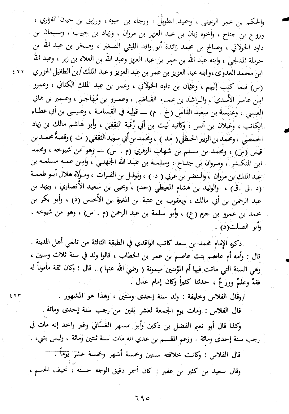 والحكم بن عمر الرعيني وحميد الطويل ورجاء بن حيوة ورزيق بن حيان الفزاري وروح بن جناح وأخوه زيان بن عبد عبد العزيز بن مروان وزياد بن حبيب وسليمان بن داود الخوىني وصالح بن محمد زائدة أبو وافد الليثي الصغير وصخر بن عبد الله بن حرملة المدلجي وابنه عبد الله بن عمر بن عبد العزيز وعبد الله بن علاء بن زبر وعبد الله ابن محمد العدوى وابنه عبد العزيز بن عمر بن عبد العزيز وعبد الملك بن الطفيل الجزري فيما كتب إليهم وعثمان بن داود الخولاني وعمر بن عبد الملك الكناني وعمرو ابن عامر الأسدي والراشد بن عمرو القاضي وعمرو بن مهاجر وعمير بن هاني العنسي وعنبسة بن سعيد القاص قوله في القسامة وعيسى بن أبي عطاء الكاتب وغيلان بن أنس وكاتبه ليث بن أبي رقية الثقفي وأبو هاشم مالك بن زياد الحمصي ومحمد بن الزبير الحنظلي ومحمد بن أبي سويد الثقفي وقصه محمد بن قيس ومحمد بن مسلم بن شهاب الزهري وهو من شيوخه ومحمد ابن المنكدر ومروان بن جناح وسلمة بن عبد الله الجهني وابن عمه مسلمه بن عبد الملك بن مروان والنضر بن عربي ونوفل بن الفرات ومولاه هلال أبو طعمة والوليد بن هشام المعيطي ويحيى بن سعد الأنصاري ويزيد بن الرحمن بن أبي مالك ويعقوب بن عتبة بن المغيرة بن الأخنس وأبو بكر بن محمد بن عمرو بن حزم وأبو سلمة بن عبد الرحمن وهو من شيوخه وأبو الصلت ذكره الإمام محمد بن سعد كاتب الواقدي في الطبقة الثالثة من تابعي أهل المدينة قال وأمه أم عاصم بنت عاصم بن عمر بن الخطاب قالوا ولد في سنة ثلاث وستين وهي السنة التي ماتت فيها أم المؤمنين ميمونة رضي الله عنها قال وكان ثقة مأمونا له فقه وعلم وورع حدثنا كثيرا وكان إمام عدل وقال الفلاس وخليفة ولد سنة إحدى وستين وهذا هو المشهور وكذا قال أبو نعيم الفضل بن دكين وأبو مسهر الغساني وغير واحد إنه مات في رجب سنة إحدى ومائة وزعم المقسم بن عدي انه مات سنة ثنتين ومائة وليس بشيء قال الفلاس وكانت خلافته سنتين وخمسة أشهر وخمسة عشر يوما وقال سعيد بن كثير بن عفير كان أسمر دقيق الوجه حسنه نحيف الحسم