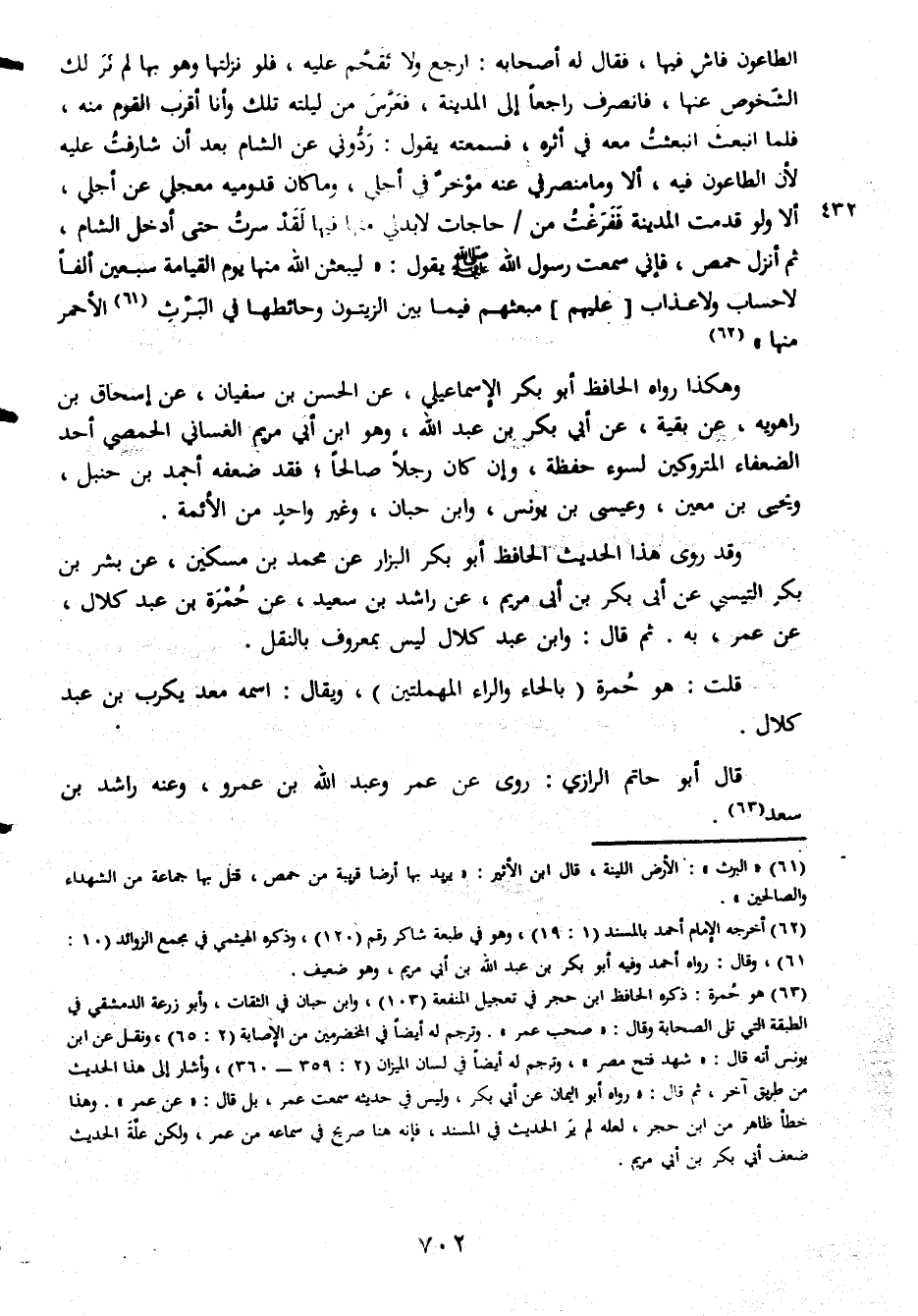 الطاعون فاش فيها فقال له أصحابه ارجع ولا تقحم عليه فلو نزلتها وهو بها لم نر لك الشخوص عنها فانصرف راجعا إلى المدينة فعرس من ليلته تلك وأنا أقرب القوم منه فلما انبعث انبعثت معه في أثره فسمعته يقول ردوني عن الشام بعد أن شارفت عليه لأن الطاعون فيه ألا وما منصرفي عنه مؤخر في أجلي وما كان قدوميه معجلي عن أجلي ألا ولو قدمت المدينة ففرغت من حاجات لا بدلي منها فيها لقد سرت حتى أدخل الشام ثم أنزل حمص فإني سمعت رسول الله صلى الله عليه وسلم يقول ليبعثن الله منها يوم القيامة سبعين ألفا لا حساب ولا عذاب عليهم مبعثهم فيما الزيتون وحائطها في البرث الأحمر منها هكذا رواه الحافظ أبو بكر الإسماعيلي عن الحسن بن سفيان عن إسحاق بن راهوية عن بقية عن أبي بكر بن عبد الله وهو ابن أبي مريم الغساني الحمصي أحد الضعفاء المتروكين لسوء حفظة وإن كان رجلا صالحا فقد ضعفه أحمد بن حنبل ويحيى بن معين وعيسى بن يونس وابن حبان وغير واحد من الأئمة وقد روى هذا الحديث الحافظ أبو بكر البراز عن محمد بن مسكين عن بشر بن التيسي عن أبي بكر بن أبي مريم عن راشد بن سعيد عن حمرة بن بن عبد كلال عن عمر به ثم قال وابن عبد كلال ليس بمعروف بالنقل قلت هو حمرة بالحاء والراء المهملتين ويقال اسمه معد يكرب بن عبد كلال قال أبو حاتم الرازي روى عن عمر وعبد الله بن عمرو وعنه راشد بن سعد