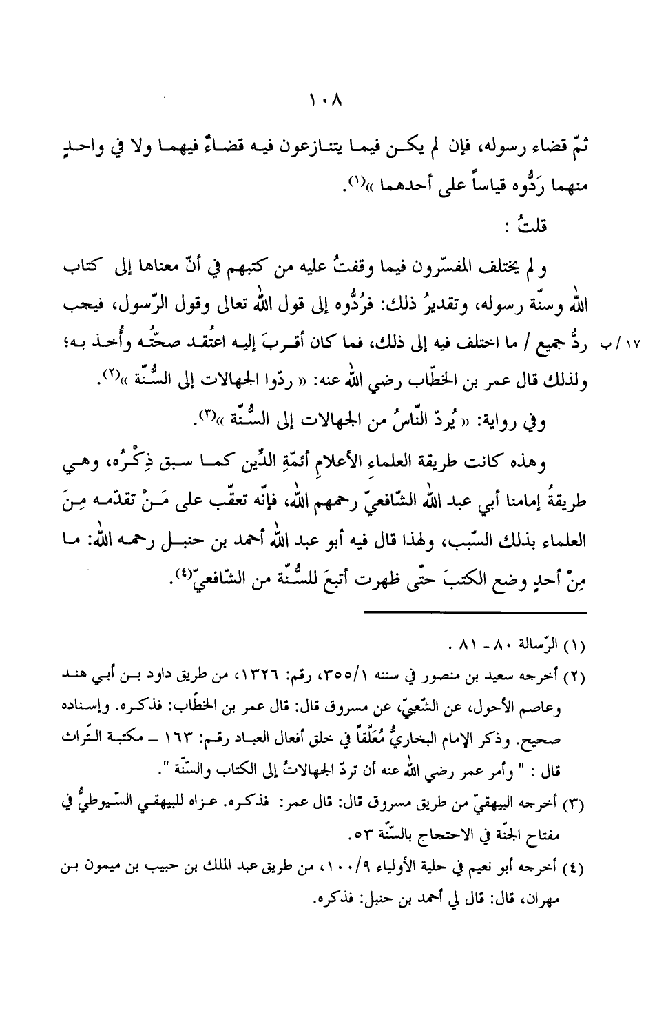 وهذه كانت طريقة العلماء الأعلام أئمة الدين كما سبق ذكره, وهي طريقة إمامنا أبي عبد الله الشافعي رحمهم الله, فإنه تعقب على من تقدمه من العلماء بذلك السبب, ولهذا قال فيه أبو عبد الله أحمد بن حنبل رحمه الله: ما من أحد وضع الكتب حتى ظهرت أتبع للسنة من الشافعي.