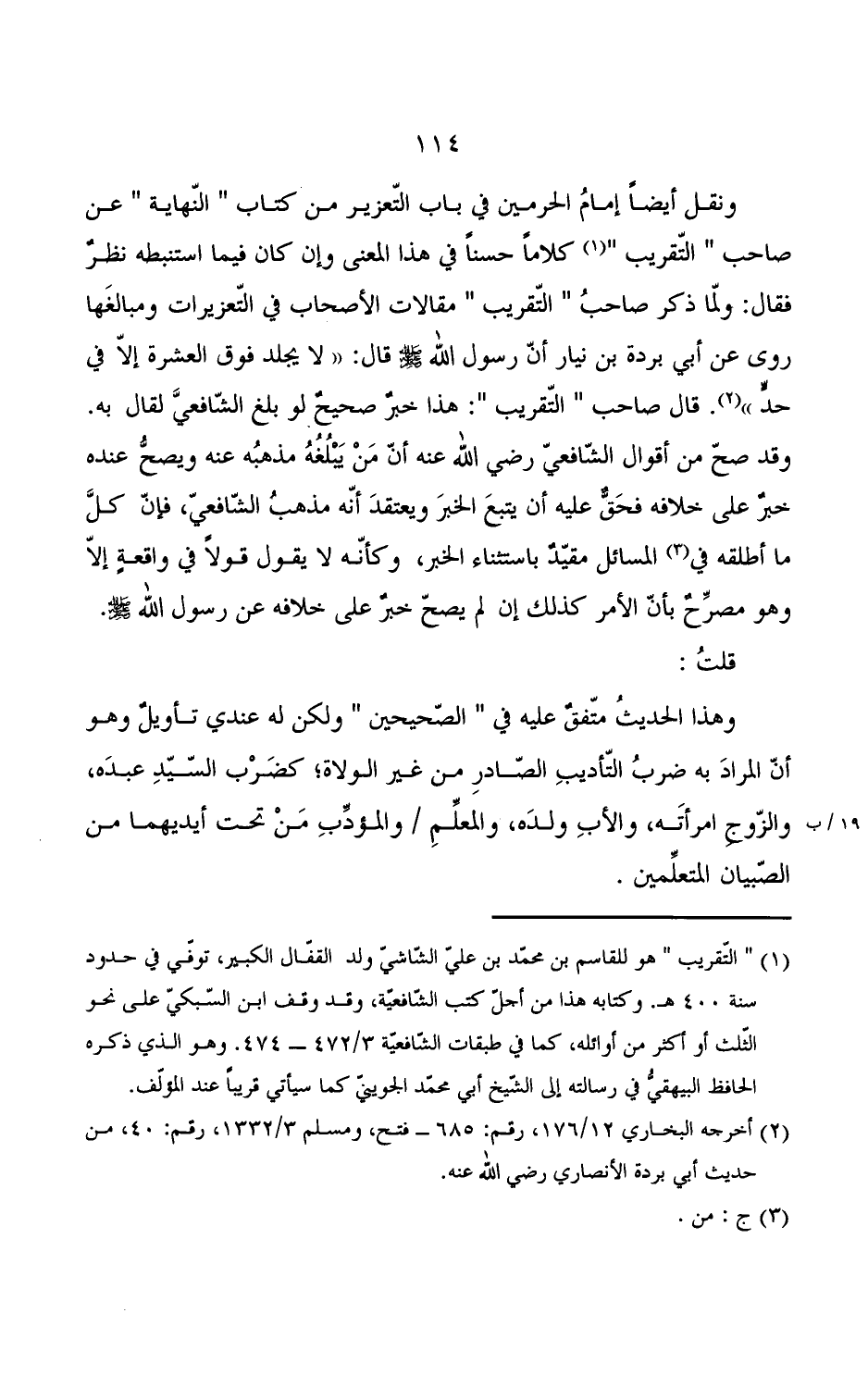 ونقل أيضا إمام الحرمين في باب التعزيز من كتاب "النهاية" عن صاحب "التقريب" كلاما حسنا في هذا المعنى وإن كان فيما استنبطه نظر فقال: ولما ذكر صاحب "التقريب" مقالات الأصحاب في التعزيزات ومبالغها روى عن أبي بردة بن نيار أن رسول الله صلى الله عليه وسلم قال: ((لا يجلد فوق العشرة إلا في حد)). قال صاحب "التقريب": هذا خبر صحيح لو بلغ الشافعي لقال به.