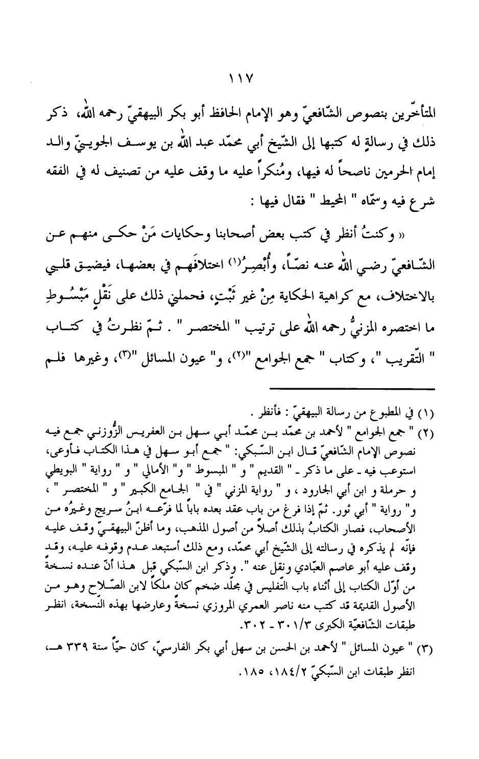المتأخرين بنصوص الشافعي وهو الإمام الحافظ أبو بكر البيهقي رحمه الله, ذكر ذلك في رسالة له كتبها إلى الشيخ أبي محمد عبد الله بن يوسف الجويني والد إمام الحرمين ناصحا له فيها, ومنكرا عليه ما وقف عليه من تصنيف له في الفقه شرع فيه وسماه "المحيط" فقال فيها: