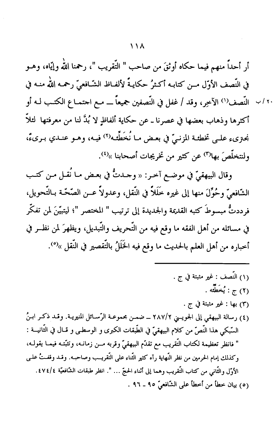 وقال البيهقي في موضع آخر: ((وجدت في بعض ما نقل من كتب الشافعي وحول منها إلى غيره خللا في النقل, وعدولا عن الصحة بالتحويل, فرددت مبسوط كتبه القديمة والجديدة إلى ترتيب "المختصر"؛ ليتبين لمن تفكر في مسائله من أهل الفقه ما وقع فيه من التحريف والتبديل, ويظهر لمن نظر في أخباره من أهل العلم بالحديث ما وقع فيه الخلل بالتقصير في النقل)).