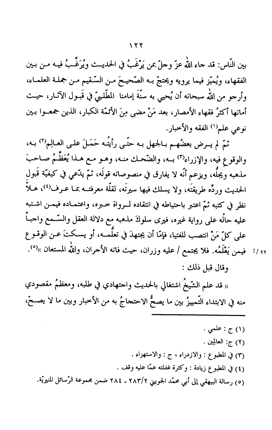 بين الناس: قد جاء الله عز وجل بمن يرغب في الحديث ويرغب فيه من بين الفقهاء, ويميز فيما يرويه ويحتج به الصحيح من السقيم من جملة العلماء, وأرجو من الله سبحانه أن يحي به سنة إمامنا المطلبي في قبول الآثار, حيث أماتها أكثر فقهاء الأمصار, بعد من مضى من الأئمة الكبار, الذين جمعوا بين نوعي علم الفقه والأخبار.