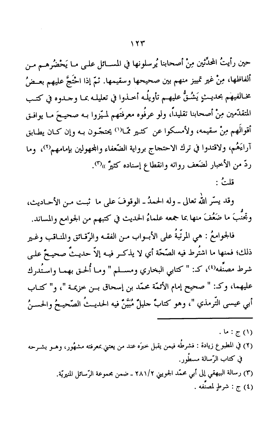 فالجوامع: هي المرتبة على الأبواب من الفقه والرقائق والمناقب وغير ذلك؛ فمنها ما اشترط فيه الصحة أي لا يذكر فيه إلا حديث صحيح شرط مصنفه, كـ: "كتابي البخاري ومسلم" وما ألحق بهما واستدرك عليهما, وكـ: "صحيح إمام الأئمة محمد بن إسحاق بن خزيمة", و"كتاب أبي عيسى الترمذي", وهو كتاب جليل مبين فيه الحديث الصحيح والحسن
