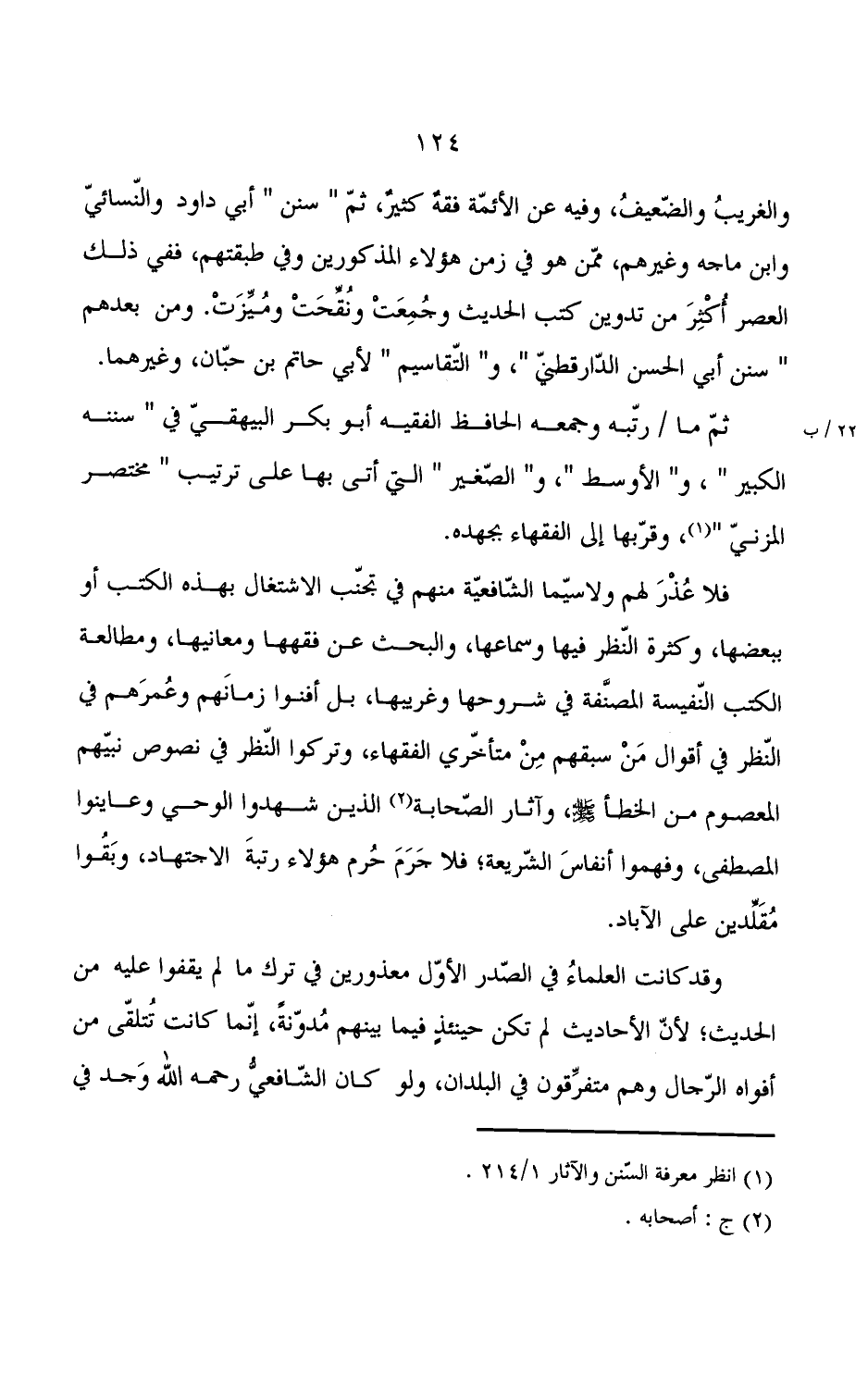 ثم ما / رتبه وجمعه الحافظ الفقيه أبو بكر البيهقي في "سننه الكبير", و"الأوسط", و"الصغير" التي أتى بها على ترتيب "مختصر المزني", وقربها إلى الفقهاء بجهده. فلا عذر لهم ولا سيما الشافعية منهم في تجنب الاشتغال بهذه الكتب أو ببعضها. وكثر النظر فيها وسماعها, والبحث عن فقهها ومعانيها, ومطالعة الكتب النفيسة المصنفة في شروحها وغريبها, بل أفنوا زمانهم وعمرهم في النظر في أقوال من سبقهم من متأخري الفقهاء, وتركوا النظر في نصوص نبيهم المعصوم من الخطأ صلى الله عليه وسلم, وآثار الصحابة الذين شهدوا الوحي وعاينوا المصطفى, وفهموا أنفاس الشريعة؛ فلا جرم حرم هؤلاء رتبة الاجتهاد, وبقوا مقلدين على الآباد.
