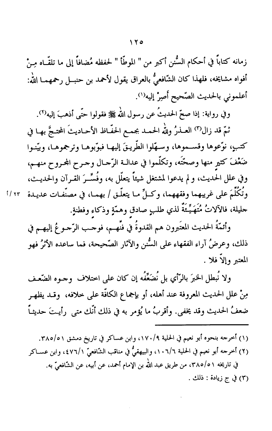 وأئمة الحديث المعتبرون هم القدوة في فنهم, فوجب الرجوع إليهم في ذلك, وعرض آراء الفقهاء على السنن والآثار الصحيحة, فما ساعده الأثر فهو المعتبر وإلا فلا.