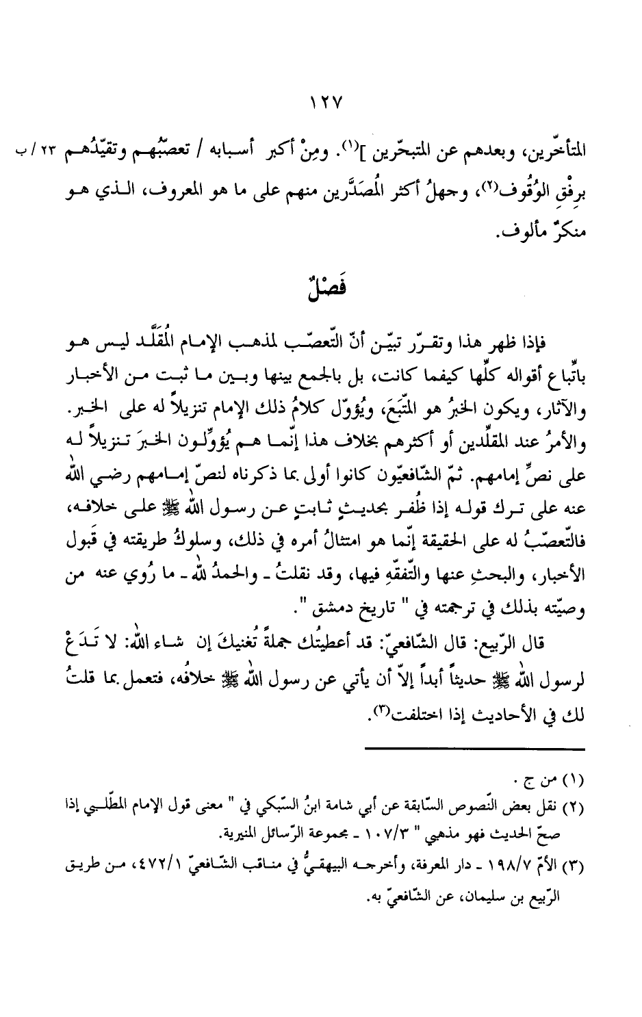 فإذا ظهر هذا وتقرر تبين أن التعصب لمذهب الإمام المقلد ليس هو باتباع أقواله كلها كيفما كانت, بل بالجمع بينهما وبين ما ثبت من الأخبار والآثار, ويكون الخبر هو المتبع, ويؤول كلام ذلك الإمام تنزيلا له الخبر. والأمر عند المقلدين أو أكثرهم بخلاف هذا إنما هم يؤولون الخبر تنزيلا له على نص إمامهم. ثم الشافعين كانوا أولى بما ذكرناه لنص إمامهم رضي الله عنه على ترك قوله إذا ظفر بحديث ثابت عن رسول الله صلى الله عليه وسلم على خلافه, فالتعصب له على الحقيقة إنما هو امتثال أمره في ذلك, وسلوك طريقته في قبول الأخبار, والبحث عنها والتفقه فيها, وقد نقلت - والحمد لله - ما روي عنه من وصيته بذلك في ترجمته في "تاريخ دمشق".