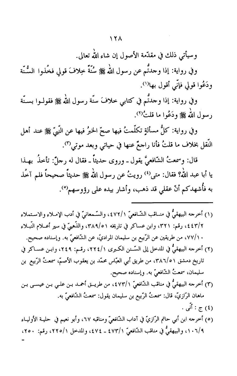 قال: وسمعت الشافعي يقول - وروي حديثا - فقال له رجل: تأخذ بهذا يا أبا عبد الله؟ فقال: متى رويت عن رسول الله صلى الله حديثا صحيحا فلم آخذ به فأشهدكم أن عقلي قد ذه, وأشار بيده على رؤوسهم.