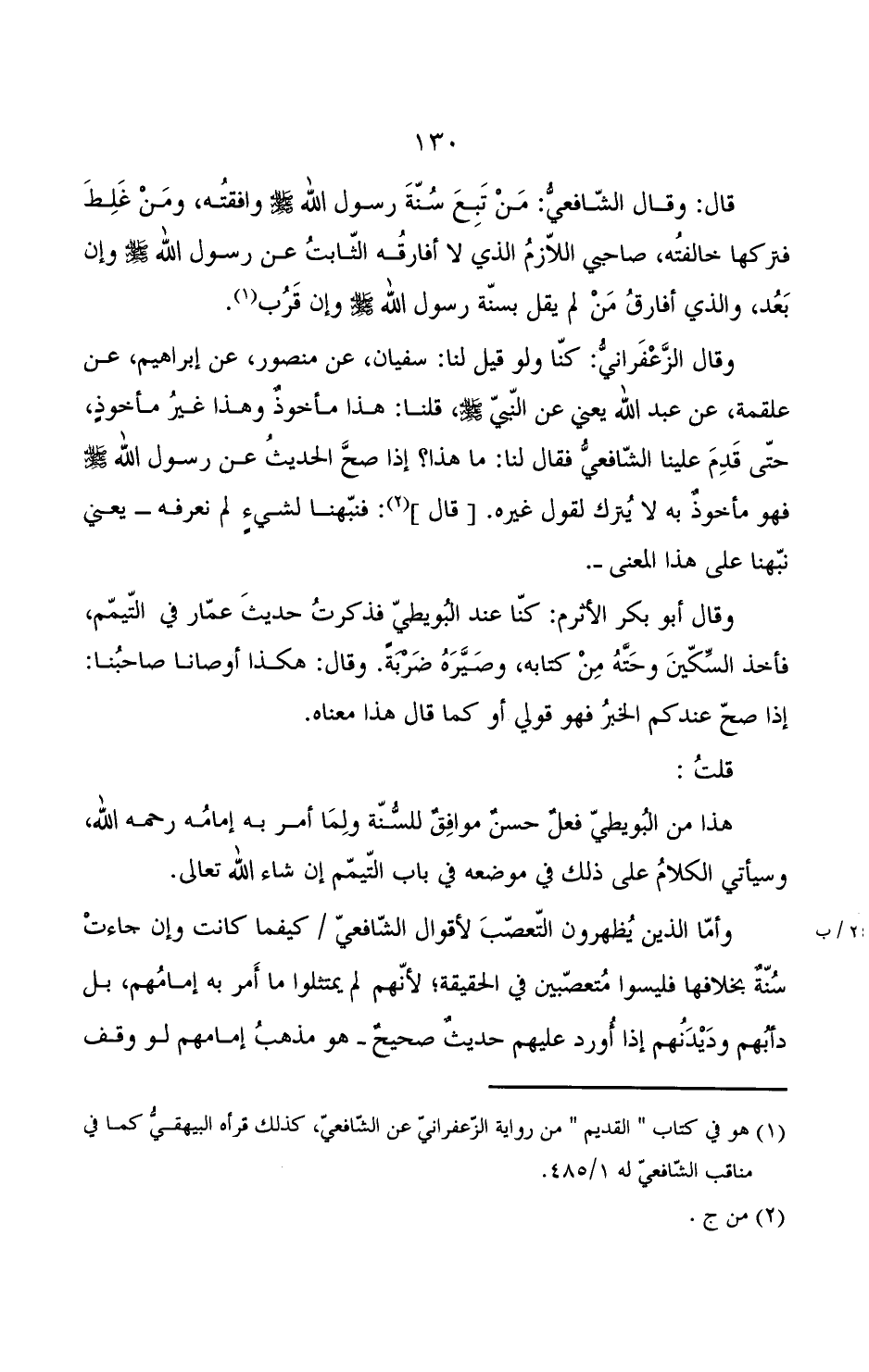 وأما الذين يظهرون التعصب لأقوال الشافعي / كيفما كانت وإن جاءت سنة بخلافها فليسو متعصبين في الحقيقة؛ لأنهم لم يمتثلوا ما أمر به إمامهم, بل دأبهم وديدنهم إذا أورد عليهم حديث صحيح - هو مذهب إمامهم, لو وقف