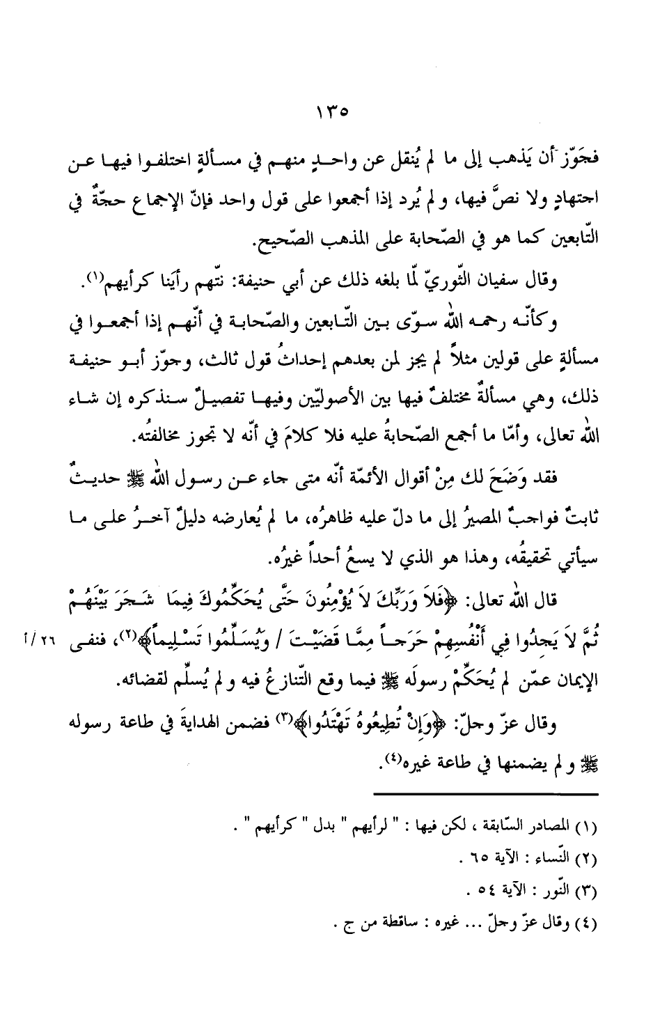 قال الله تعالى: {فلا وربك لا يؤمنون حتى يحكموك فيما شجر بينهم ثم لا يجدوا في أنفسهم حرجا مما قضيت / ويسلموا تسليما} , فنفي الإيمان عمن لم يحكم رسوله صلى الله عليه وسلم فيما وقع التنازع فيه ولم يسلم لقضائه.