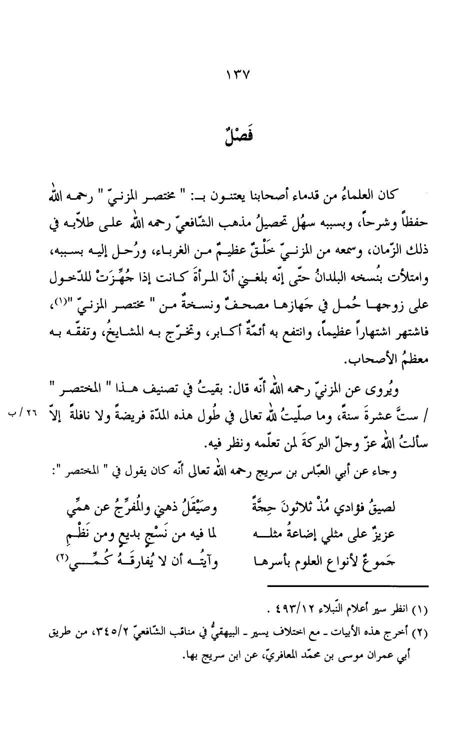 ويروى عن المزني رحمه الله أنه قال: بقيت في تصنيف هذا " المختصر " ست عشرة سنة, وما صليت الله تعالى في طول هذه المدة فريضة ولا نافلة إلا سألت الله عز وجل البركة لمن تعلمه ونظر في وجاء عن أبي العباس بن سريج رحمه الله تعالى أنه كان يقول في " المختصر ":