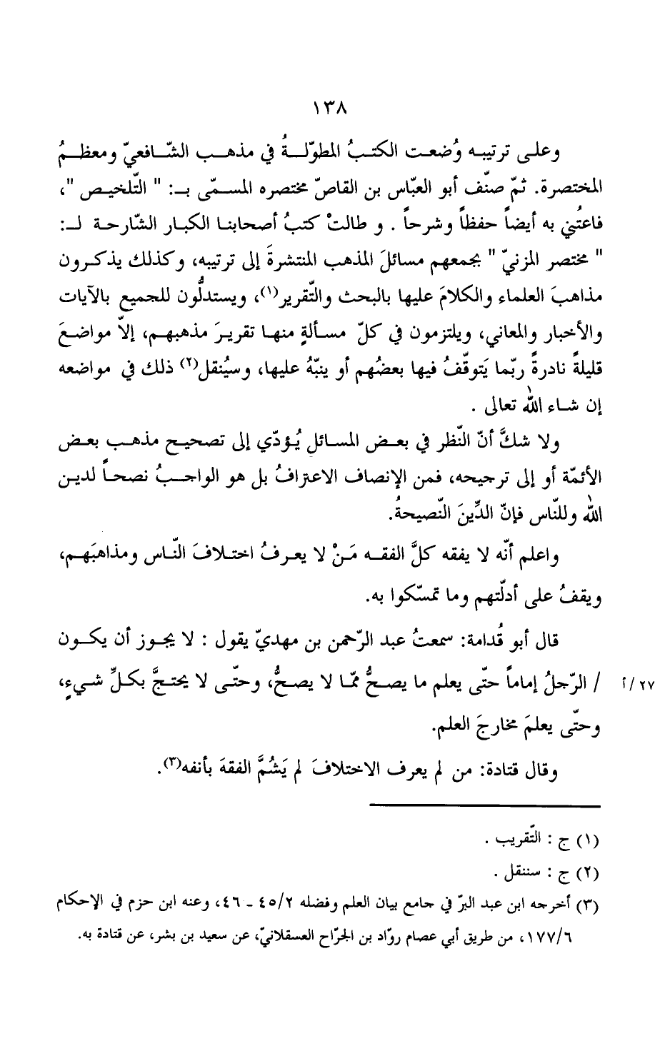 وعلى ترتيبه وضعت الكتب المطولة في مذهب الشافعي ومعظم المختصرة. ثم صنف أبو العباس بن القاص مختصره المسمى ب:"التلخيص", فاعتنى به أيضا حفظا وشرحا. وطالت كتب أصحابنا الكبار الشارحة ل: "مختصر المزني" يجمعهم مسائل المذهب المنتشرة إلى ترتيبه, وكذلك يذكرون مذاهب العلماء والكلام عليها بالبحث والتقرير, ويستدلون للجميع بالآيات والأخبار والمعاني, ويلتزمون في كل مسألة منها تقرير مذهبهم, إلا مواضع قليلة نادرة ربما يتوقف فيها بعضهم أو ينبه عليها, وسينقل ذلك في مواضعه إن شاء الله تعالى.