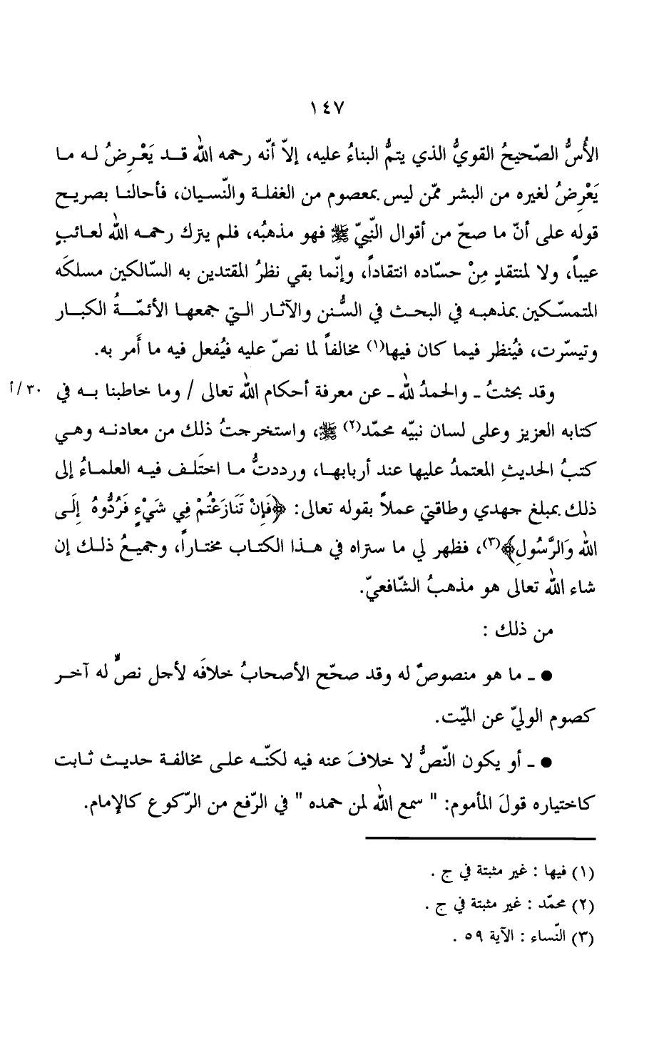 الأس الصحيح القوي الذي يتم البناء عليه, إلا أنه رحمه الله قد يعرض له ما يعرض لغيره من البشر ممن ليس بمعصوم من الغفلة والنسيان, فأحالنا بصريح قوله على أن ما صح من أقوال النبي صلى الله عليه وسلم فهو مذهبه, فلم يترك رحمه الله لعائب عيبا, ولا لمنتقد من حساده انتقادا, وإنما بقي نظر المقتدين به السالكين مسلكه المتمسكين بمذهبه في البحث في السنن والآثار التي جمعها الأئمة الكبار وتيسرت, فينظر فيما كان فيها مخالفا لما نص عليه فيفعل فيه ما أمر به. وقد بحثت - والحمد لله - عن معرفة أحكام الله تعالى / وما خاطبنا به في كتابه العزيز وعلى لسان نبيه محمد صلى الله عليه وسلم, واستخرجت ذلك من معادنه وهي كتب الحديث المعتمد عليها عند أربابها, ورددت ما اختلفت فيه العلماء إلى ذلك بمبلغ جهدي وطاقتي عملا بقوله تعالى: {فإن تنازعتم في شيء فردوه إلى الله والرسول} , فظهر لي ما ستراه في هذا الكتاب مختارا, وجميع ذلك إن شاء الله هو مذهب الشافعي.