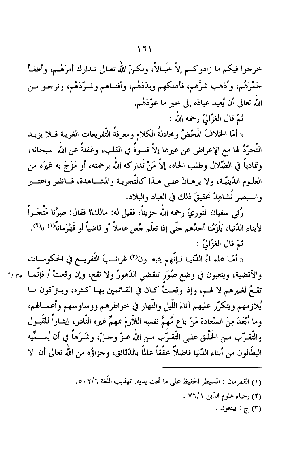 ((أما علماء الدنيا فائنهم يتبعون غرائب التفريغ في الحكومات والأقضية, ويتبعون في وضع صور تنقضي الدهور ولا تقع, وإن وقعت / فإنما تقع لغيرهم لا لهم, وإذا وقعت كان في القائمين بها كثرة, ويتركون ما يلازمهم ويتكرر عليهم آناء الليل والنهار في خواطرهم ووساوسهم وأعمالهم, وما أبعد من السعادة من باع مهم نفسه اللازم بمهم غيره النادر, إيثار للقبول والتقرب من الخلق على التقرب من الله عز وجل, وشرها في أن يسميه البطالون من أبناء الدنيا فاضلا محققا عالما بالدقائق, وجزاؤه من لا