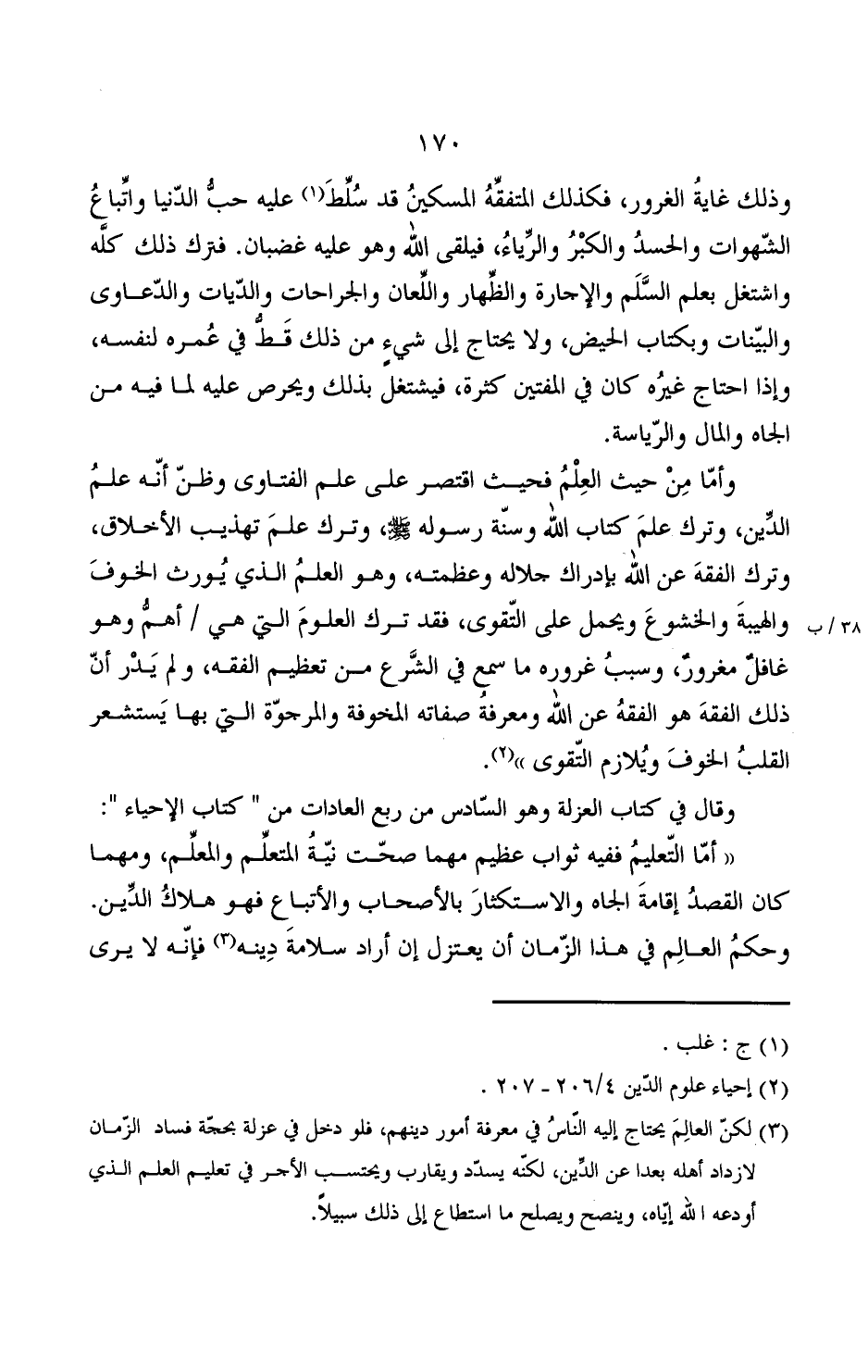 ((أما التعليم ففيه ثواب عظيم مهما صحت نية المتعلم والمعلم, ومهما كان القصد إقامة الجاه والاستكثار بالأصحال والإتباع فهو هلاك الدين.