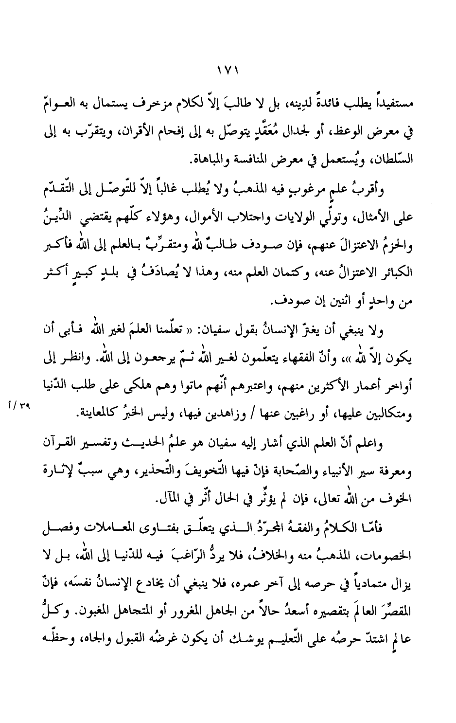 ولا ينبغي أن يغتر الانسان بقول سفيان: ((تعلمنا العلم لغير الله فأبى أن يكون إلا الله)) , وأن الفقهاء يتعلمون لغير الله ثم يرجعون إلى الله. وانظر إلى أواخر أعمار الأكثرين منهم, واعتبرهم أنهم ماتوا وهم هلكى على طلب الدنيا ومتكالبين عليها, أو راغبين عنها / وزاهدين فيها, وليس الخبر كالمعاينة.