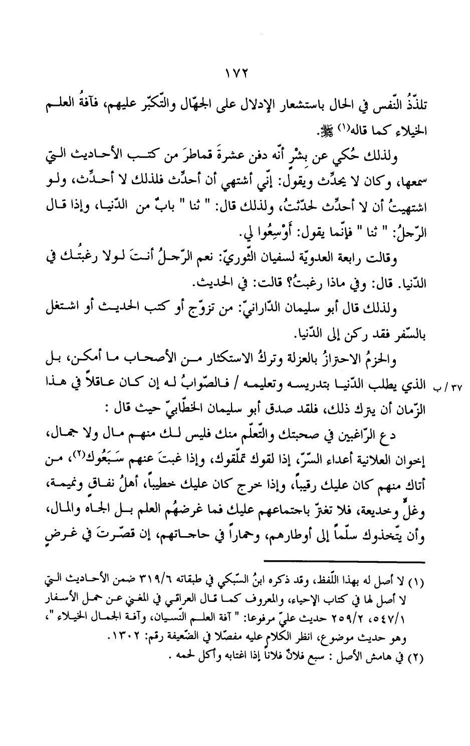 ولذلك حكى عن بشر أنه دفن عشرة قماطر من كتب الأحاديث التي سمعها, وكان لا يحدث ويقول: إني أشتهي أن أحدث فلذلك لا أحدث, ولو اشتهيت أن لا أحدث لحدثت, ولذلك قال: "ثنا" باب من الدنيا, وإذا قال الرجل: "ثنا" فإنما يقول: أوسعو لي.