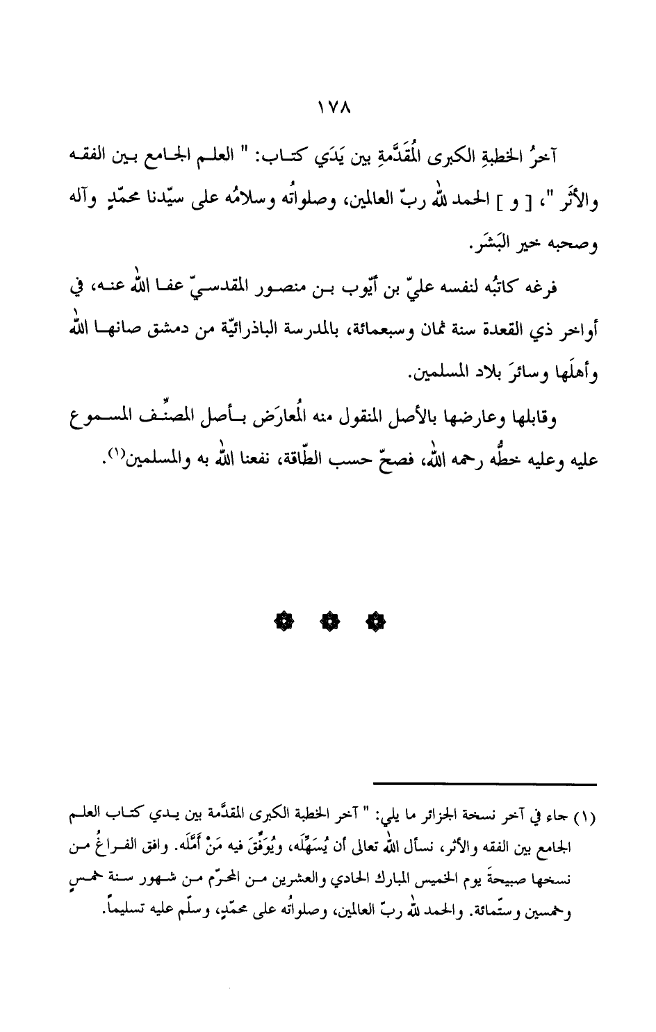 آخر الخطبة الكبرى المقدمة بين يدي كتاب: "العلم الجامع بين الفقه والأثر", [و] الحمد لله رب العالمين, وصلواته وسلامه على سيدنا محمد وآله وصحبه خير البشر.