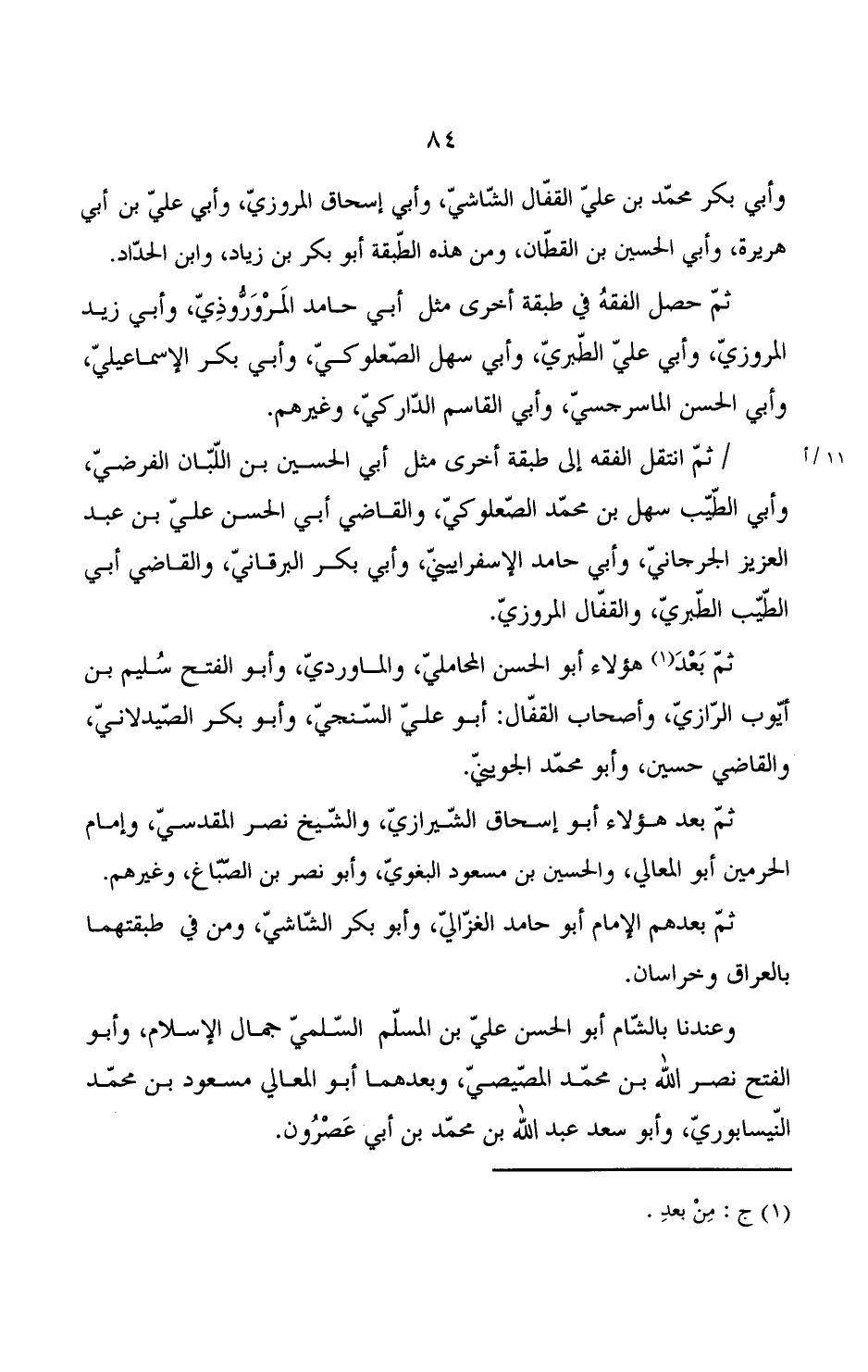 ثم بعدهم الإمام أبو حامد الغزالي, وأبو بكر الشاشي, ومن في طبقتهما بالعراق وخراسان. وعندنا بالشام أبو الحسن علي بن المسلم السلمي جمال الإسلام, وأبو الفتح نصر الله بن محمد المصيصي, وبعدهما أبو المعالي مسعود بن محمد النيسابوري, وأبو سعد عبد الله بن محمد بن أبي عصرون.