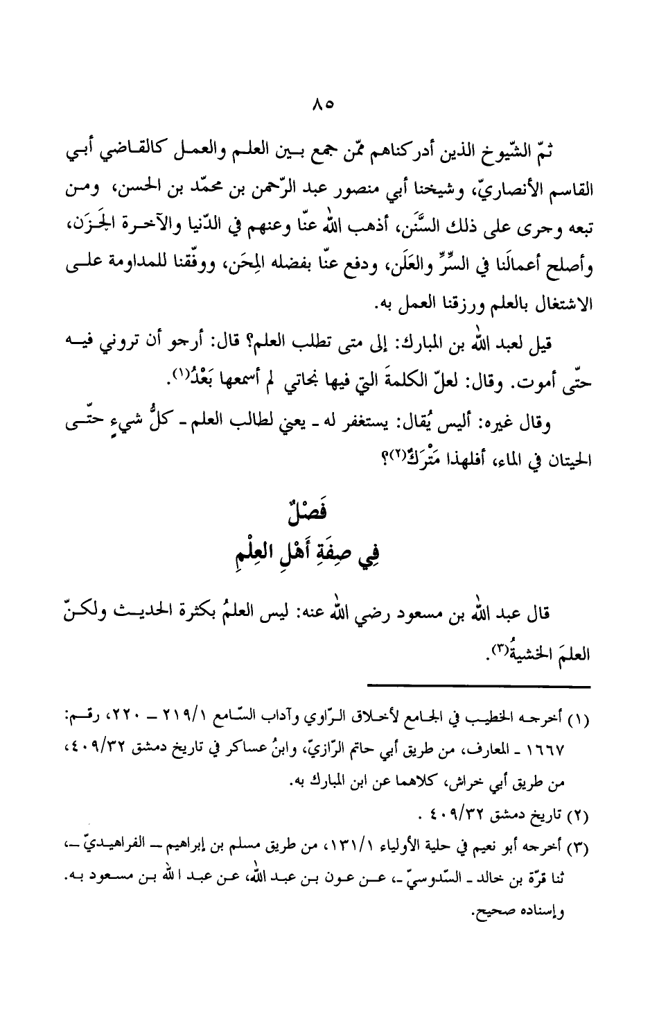ثم الشيوخ الذين أدركناهم ممن جمع بين العلم والعمل كالقاضي أبي القاسم الأنصاري, وشيخنا أبي منصور عبد الرحمن بن محمد بن الحسن, ومن تبعه وجرى على ذلك السنن, أذهب الله عنا وعنهم في الدنيا والآخرة الجزن, وأصلح أعمالنا في السر والعلن, ودفع عنا بفضله المحن, ووفقنا للمداومة على الاشتغال بالعلم ورزقنا العمل به.