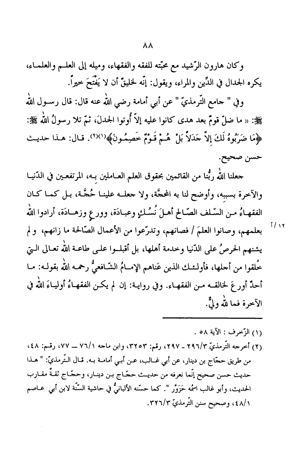 وفي جامع الترمذي عن أبي يمامة رضي الله عنه قال: قال رسول الله صلى الله عليه وسلم: ما ضل قوم بعد هدى كانوا عليه إلا أوتوا الجدل, ثم تلا رسول الله صلى الله عليه وسلم {ما ضربوه لك إلا جدلا بل هم قوم خصمون}. قال هذا حديث حسن صحيح.