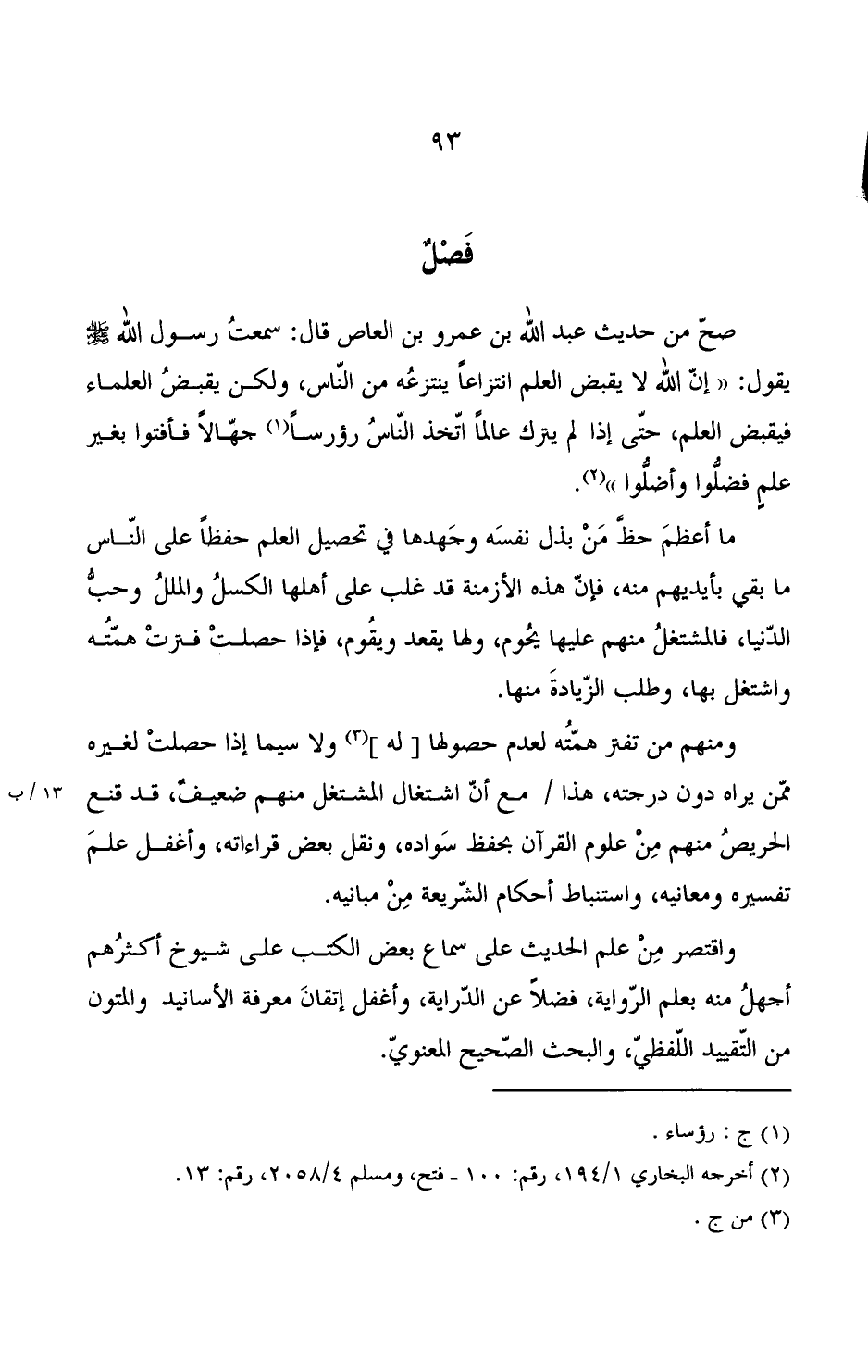 ومنهم من تفتر همته لعدم حصولها [له] ولا سيما إذا حصلت لغيره ممن يراه دون درجته, هذا / مع أن اشتغال المشتغل منهم ضعيف, قد قنع الحريص منهم من علوم القرآن بحفظ سواده, ونقل بعض قراءآته, وأغفل علم تفسيره ومعانيه, واستنباط أحكام الشريعة من مبانيه. واقتصر من علم الحديث على سماع بعض الكتب على شيوخ أكثرهم أجهل منه بعلم الرواية, فضلا عن الدراية, وأغفل إتقان معرفة الأسانيد والمتون من التقييد اللفظي, والبحث الصحيح المعنوي.