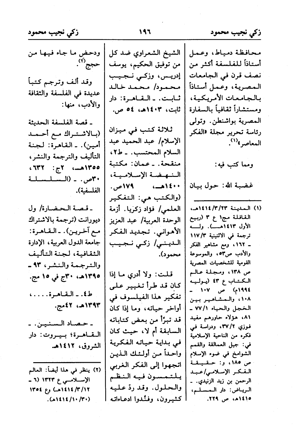 (¬1) المدينة 23/ 3/1414 هـ، القافلة مج 1 ع 3 (ربيع الأول 1413 هـ). وله ترجمة في الاثنينية 3/ 117 - 162، ومع مشاهير الفكر والأدب ص 53، والموسوعة القومية للشخصيات المصرية ص 138، ومجلة عالم الكتاب ع 43 (يوليه 1994 م) ص 107 - 108، والمشاهير بين الخجل والحياء 1/ 77 - 81، هؤلاء حاورهم مفيد فوزي 2/ 37، ودراسة في فكره من الناحية الإسلامية في: جيل العمالقة والقمم الشوامخ في ضوء الإسلام ص 185، وحقيقة الفكر الإسلامي/عبد الرحمن بن زيد الزنيدي. - الرياض: دار المسلم، 1415، ص 229.