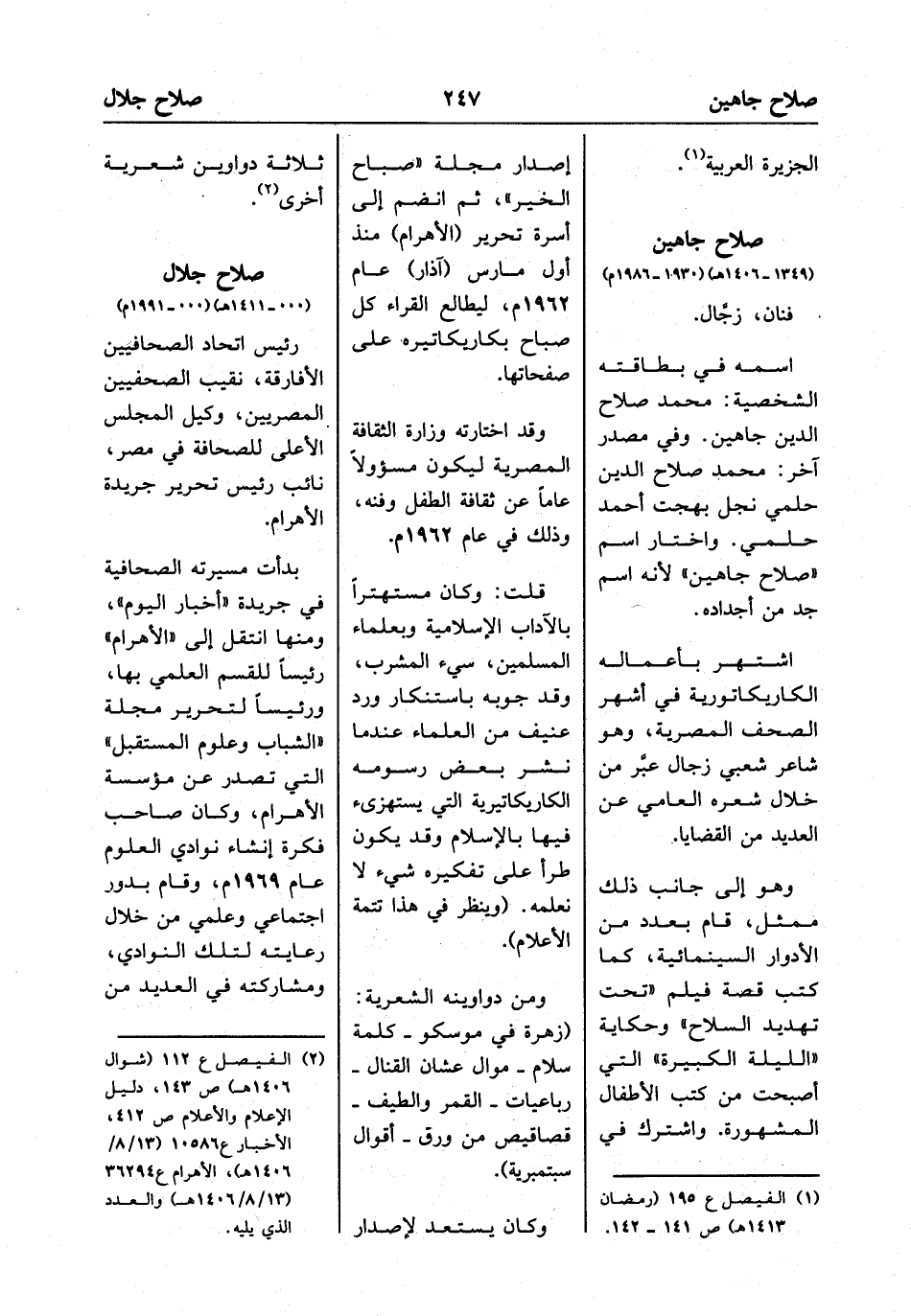(¬2) الفيصل ع 112 (شوال 1406 هـ) ص 143، دليل الإعلام والأعلام ص 412، الأخبار ع 10586 (13/ 8/1406 هـ)، الأهرام ع 36294 (13/ 8/1406 هـ) والعدد الذي يليه.