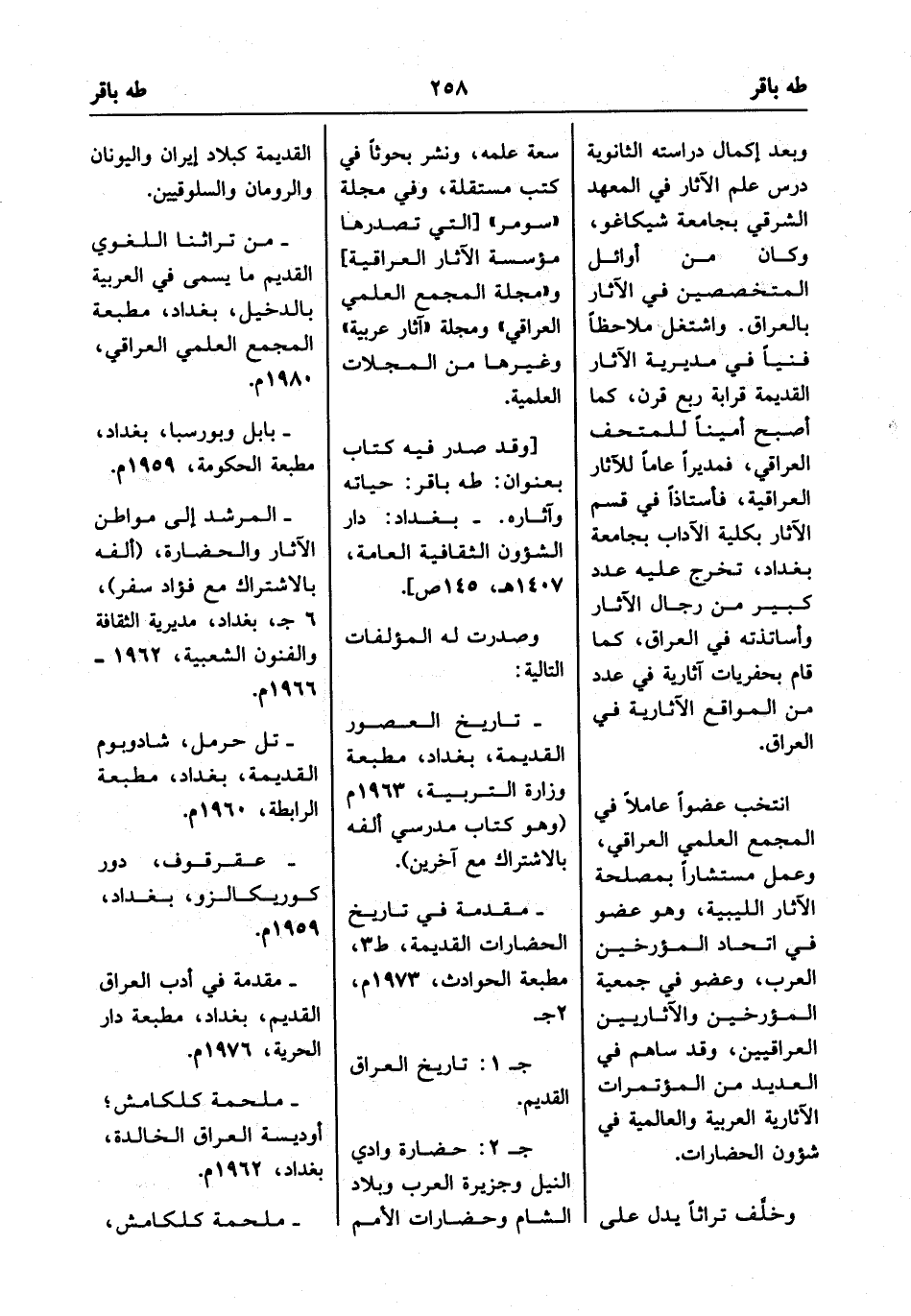[وقد صدر فيه كتاب بعنوان: طه باقر: حياته وآثاره. - بغداد: دار الشؤون الثقافية العامة، 1407 هـ، 145 ص].