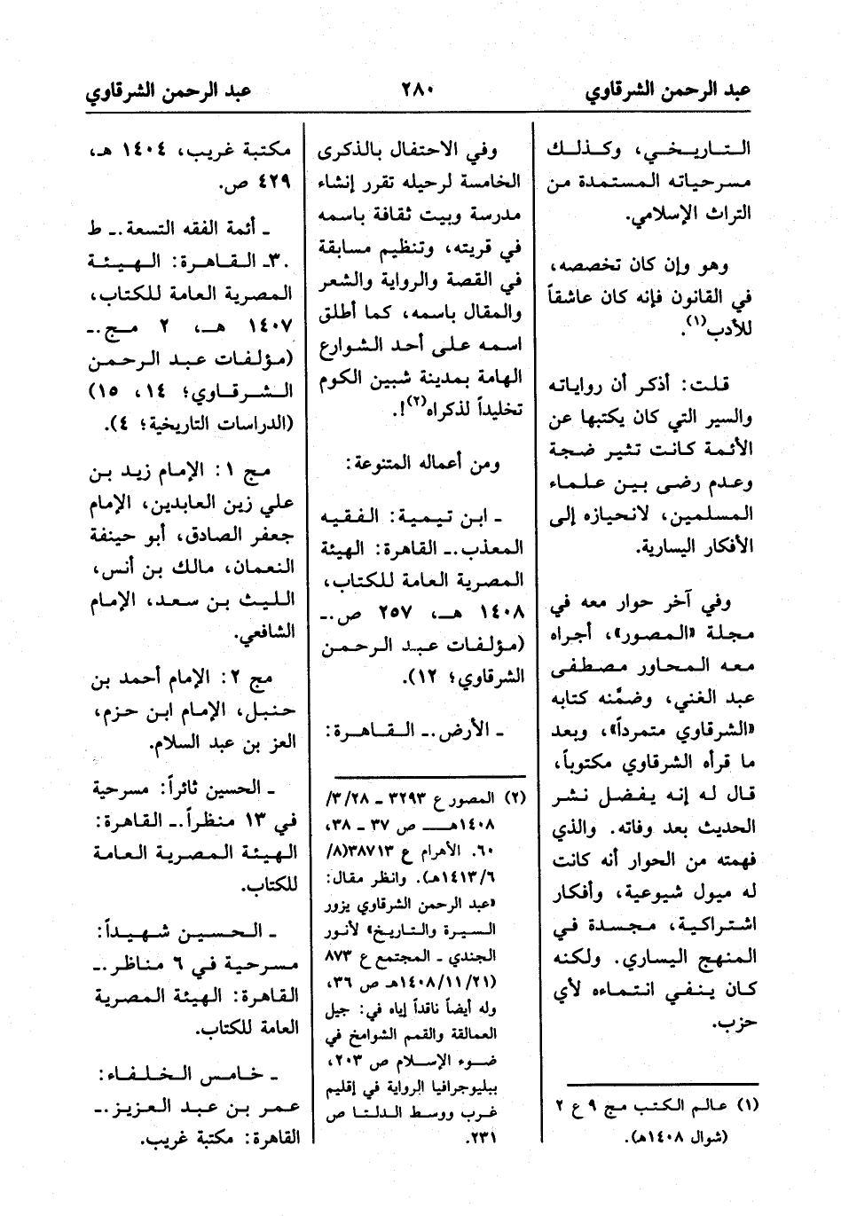 (¬2) المصور ع 3293 - 28/ 3/1408 هـ ص 37 - 38، 60. الأهرام ع 38713 (8/ 6/1413 هـ). وانظر مقال: "عبد الرحمن الشرقاوي يزور السيرة والتاريخ" لأنور الجندي - المجتمع ع 873 (21/ 11/1408 هـ) ص 36، وله أيضاً ناقداً إياه في: جيل العمالقة والقمم الشوامخ في ضوء الإسلام ص 203، ببليوجرافيا الرواية في إقليم غرب ووسط الدلتا ص 231.
